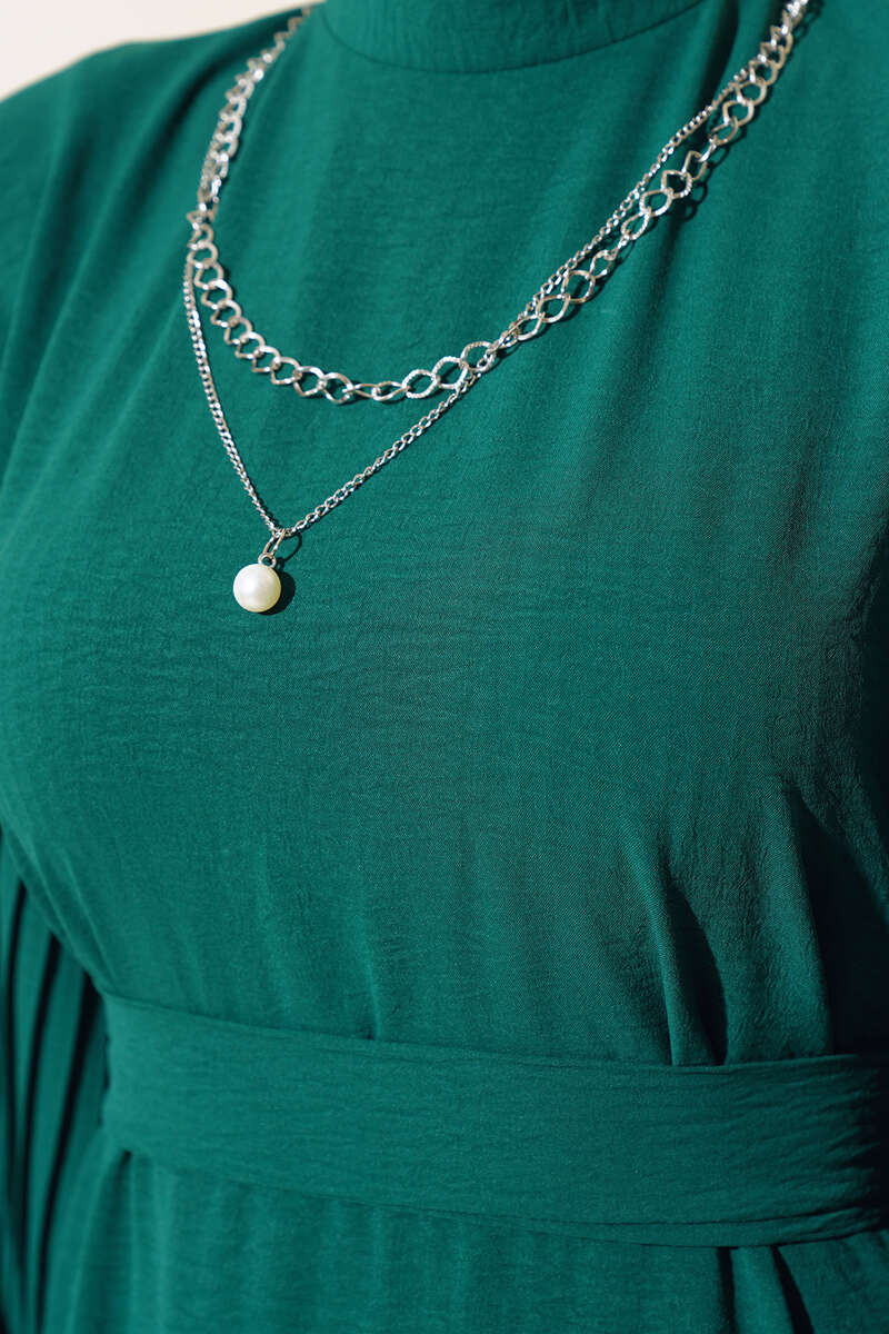 Önü Yarım Düğmeli Kat Kat Elbise Yeşil