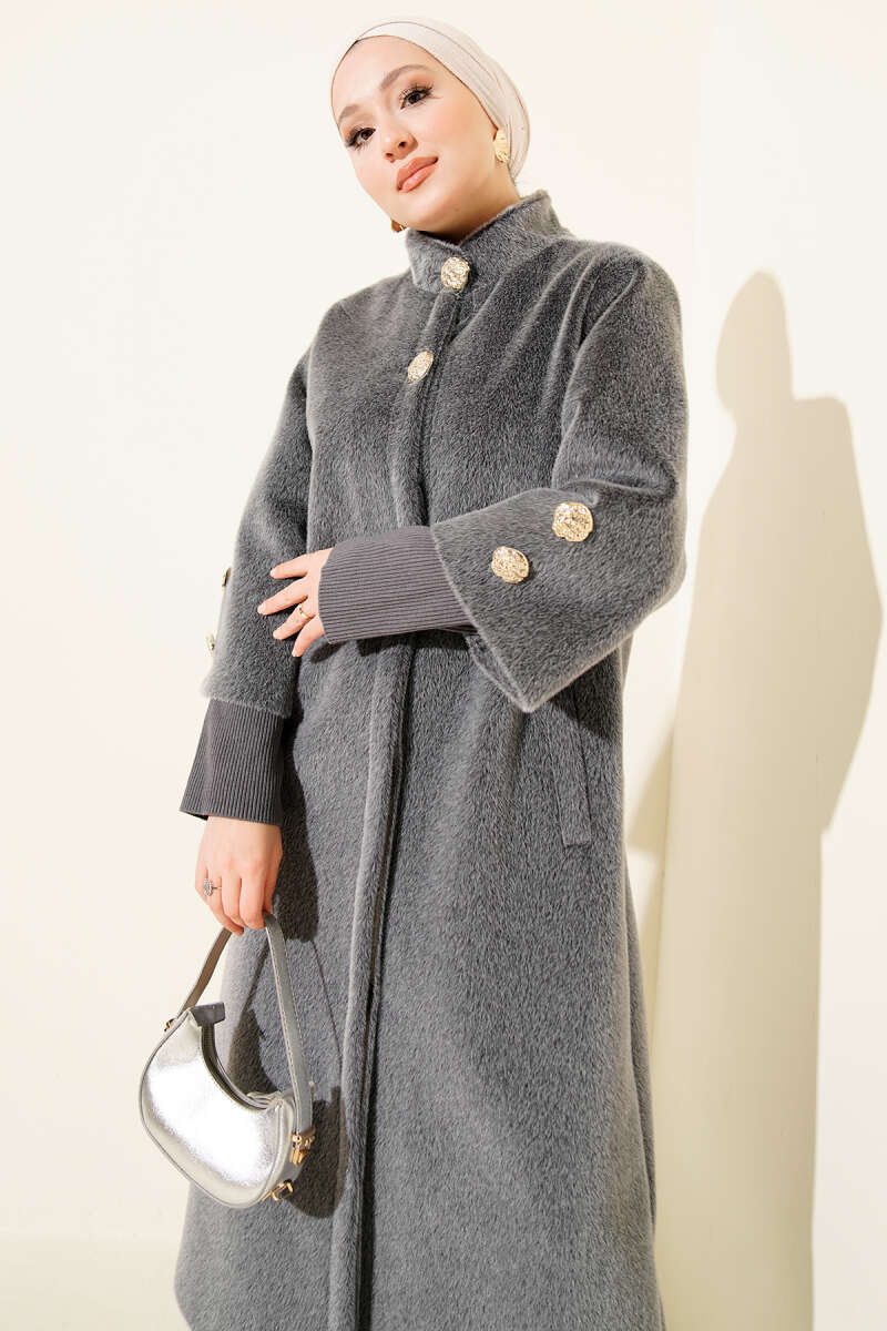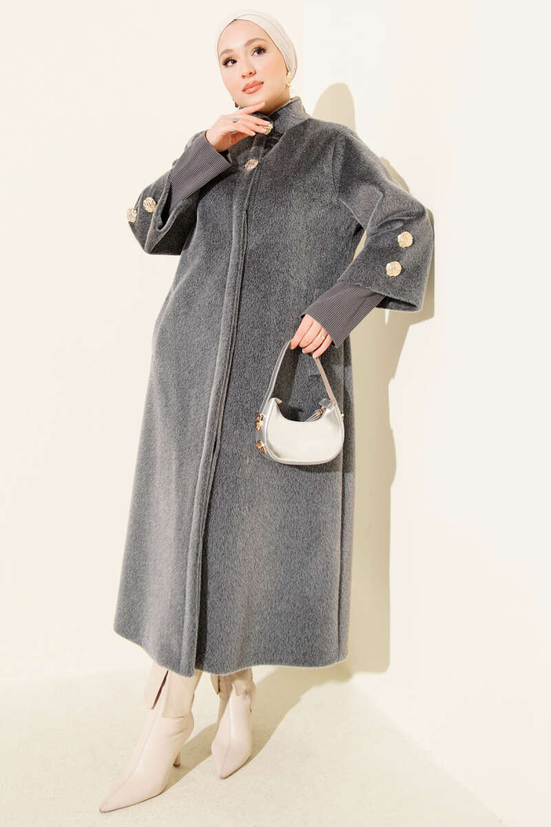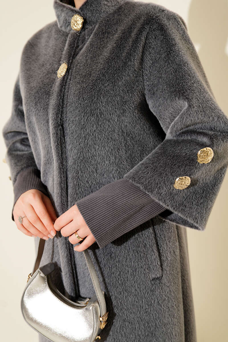 Tahta Düğmeli Kruvaze Yaka Kaşe Kaban Gri