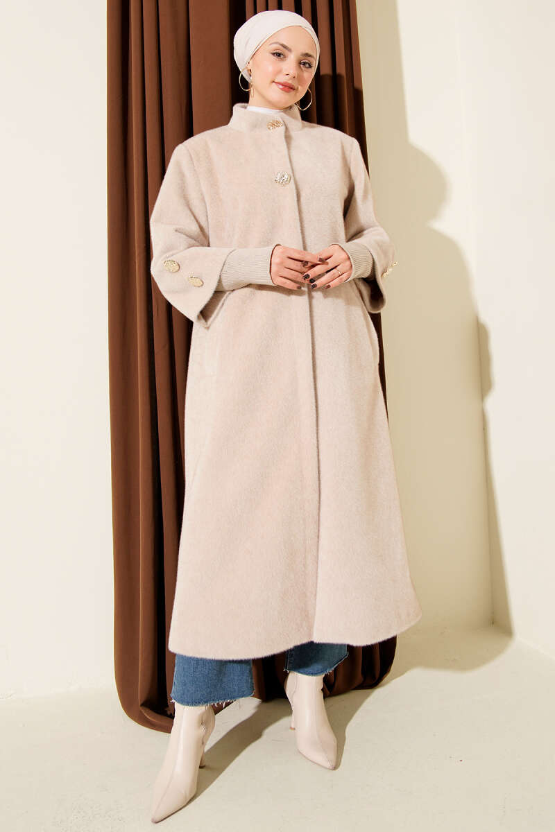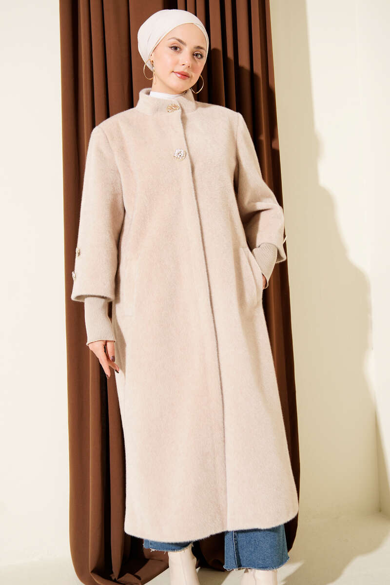Gold Broşlu Cepli Kaşe Kaban Bej
