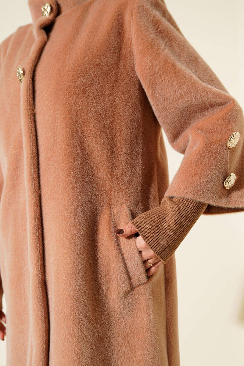 Kruvaze Gold Düğmeli Kaşe Kaban Camel