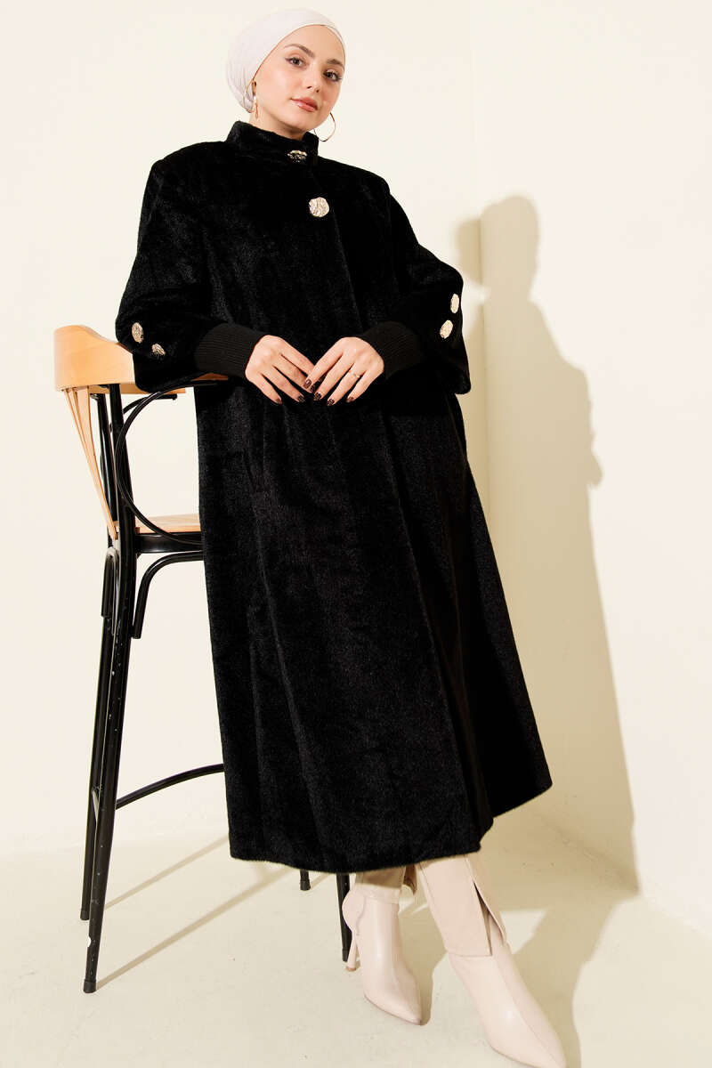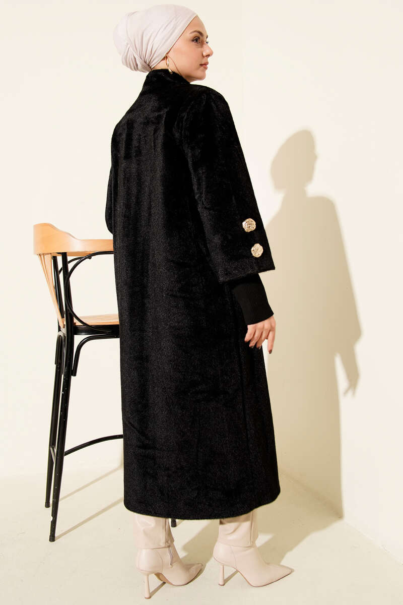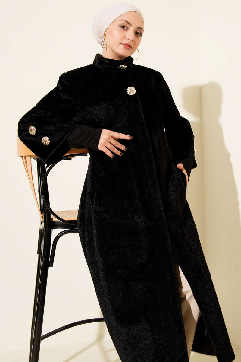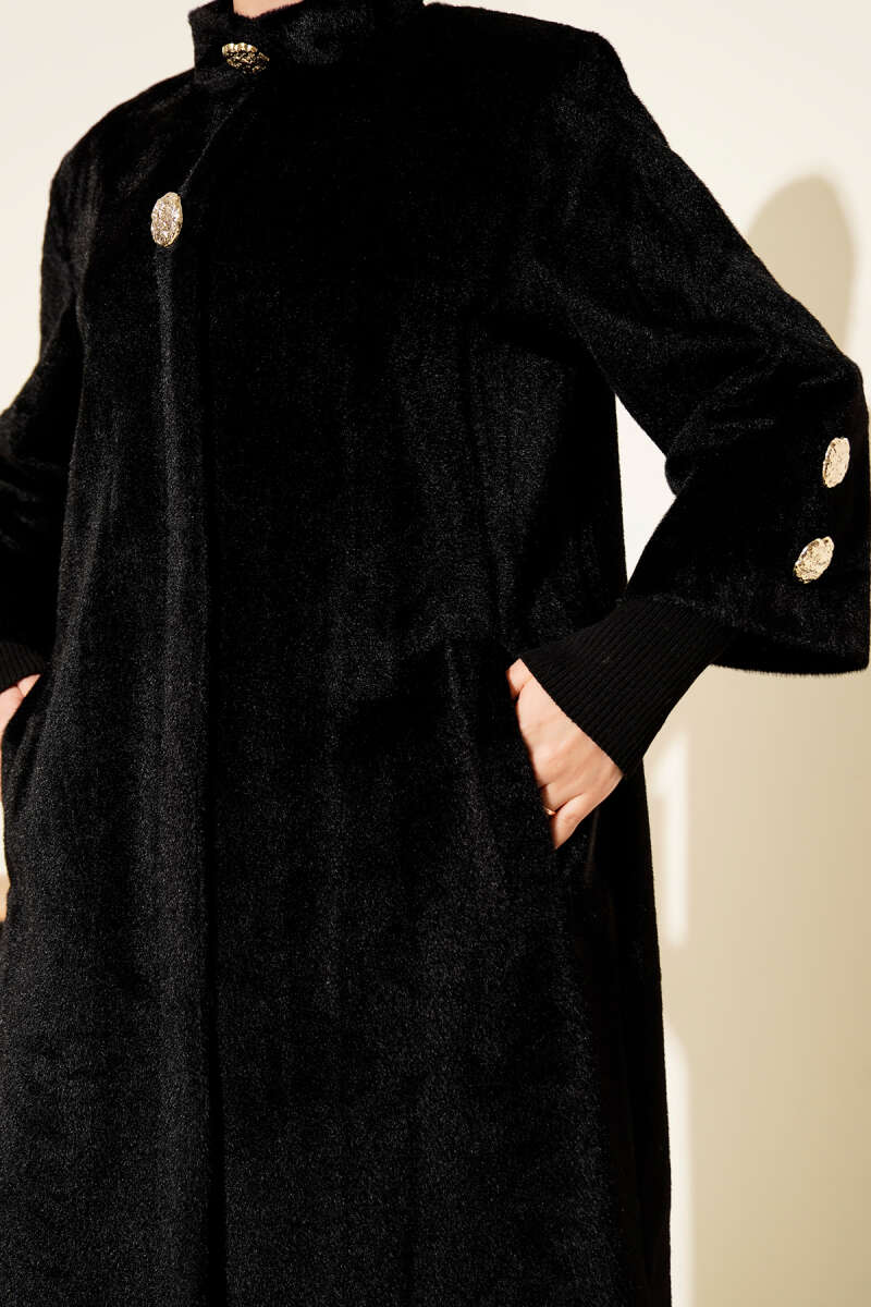 Gold Broşlu Cepli Kaşe Kaban Siyah