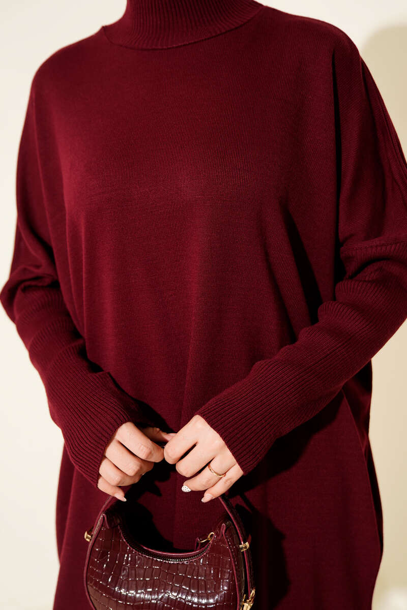 Yatay Çizgili Düşük Omuz Triko Tunik Bordo