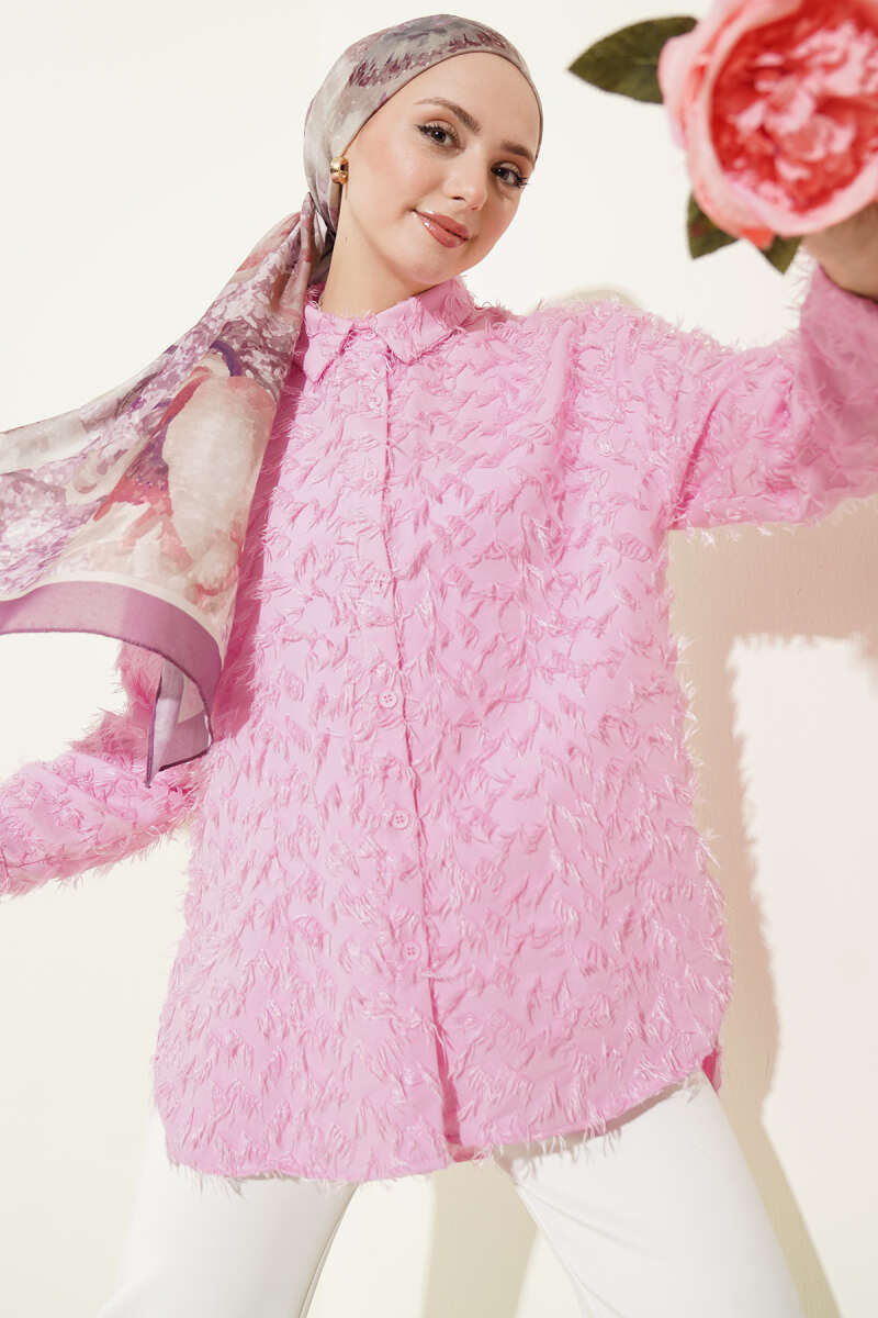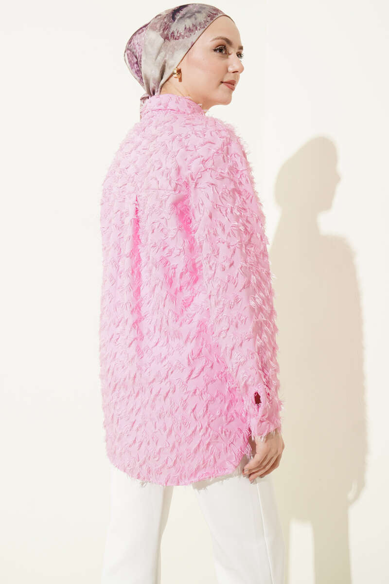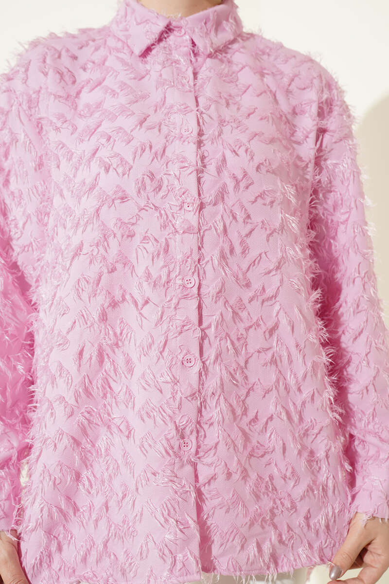 Sıradışı dokusuyla dikkat çeken bu gömlek, boydan boya saçaklı tüy detaylarıyla tasarıma modern ve zengin bir derinlik katıyor. Klasik gömlek yakası ve ton sür ton düğme kapaması, iddialı dokusunu zarif bir şekilde dengelerken, dökümlü kesimi konforlu bir kullanım sunuyor.