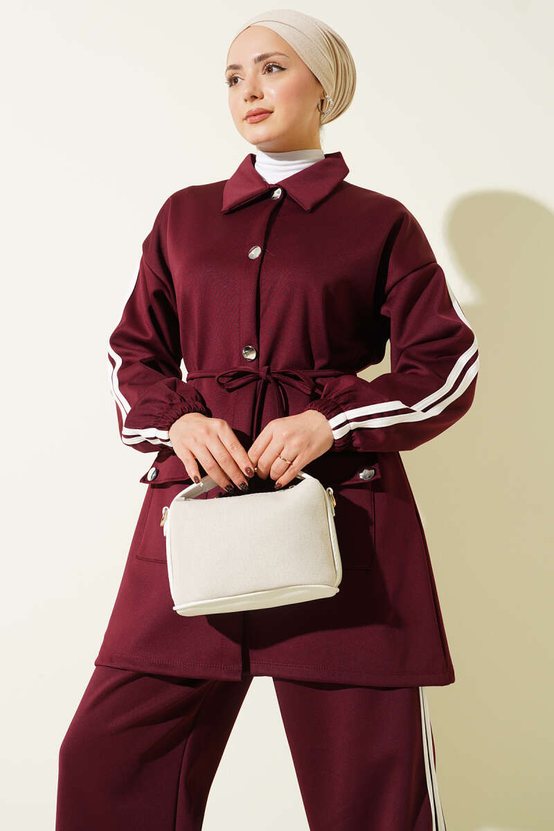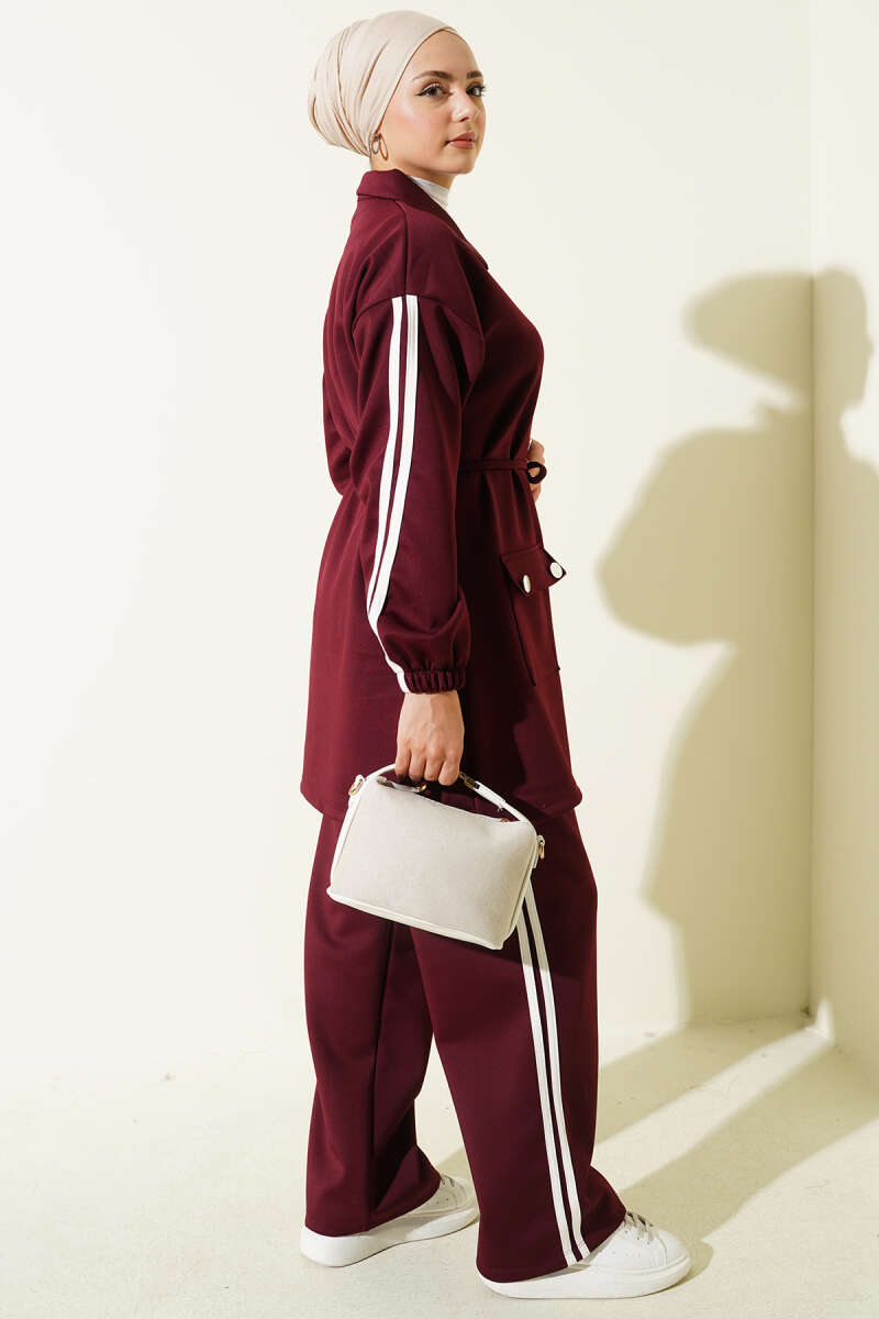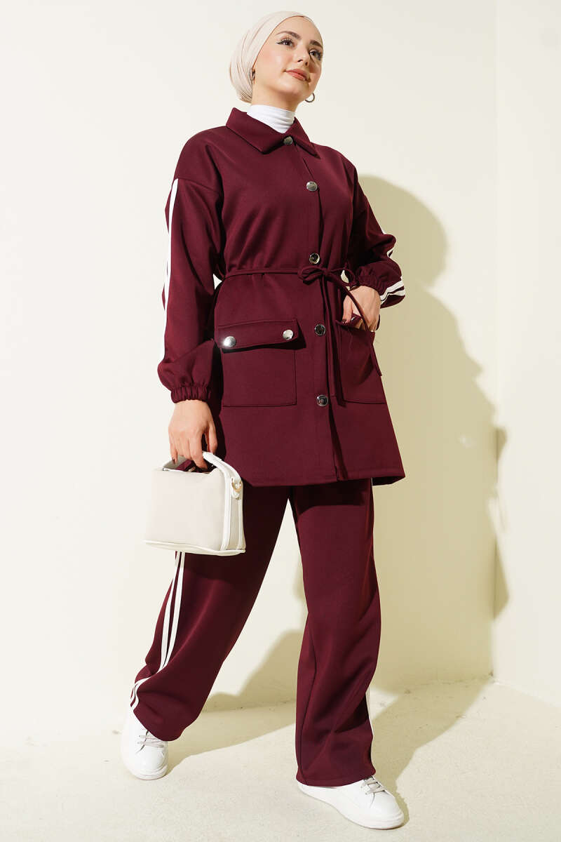 Kol Şeritli Düğmeli Scuba İkili Takım Bordo