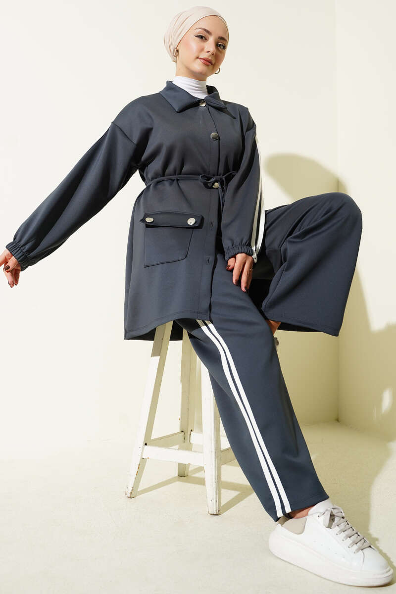 Kol Şeritli Düğmeli Scuba İkili Takım Vizon