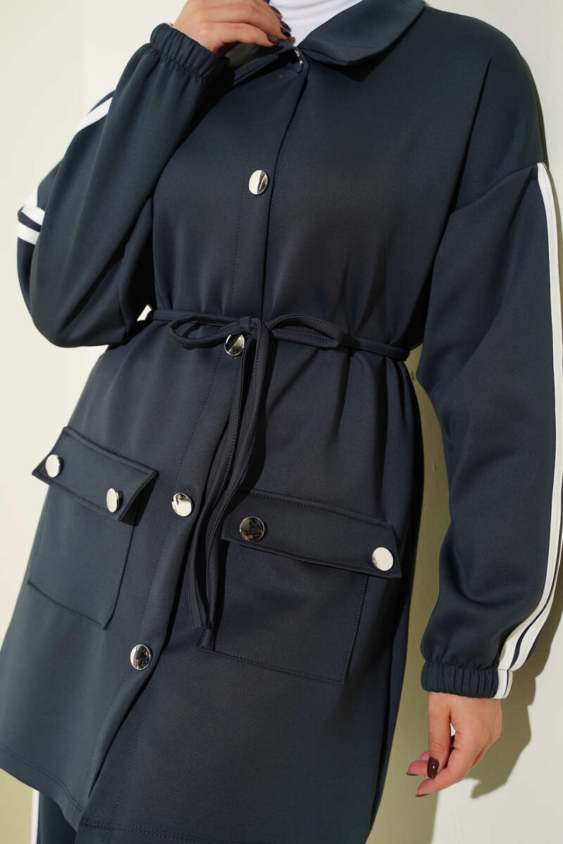 Kol Şeritli Düğmeli Scuba İkili Takım Lacivert