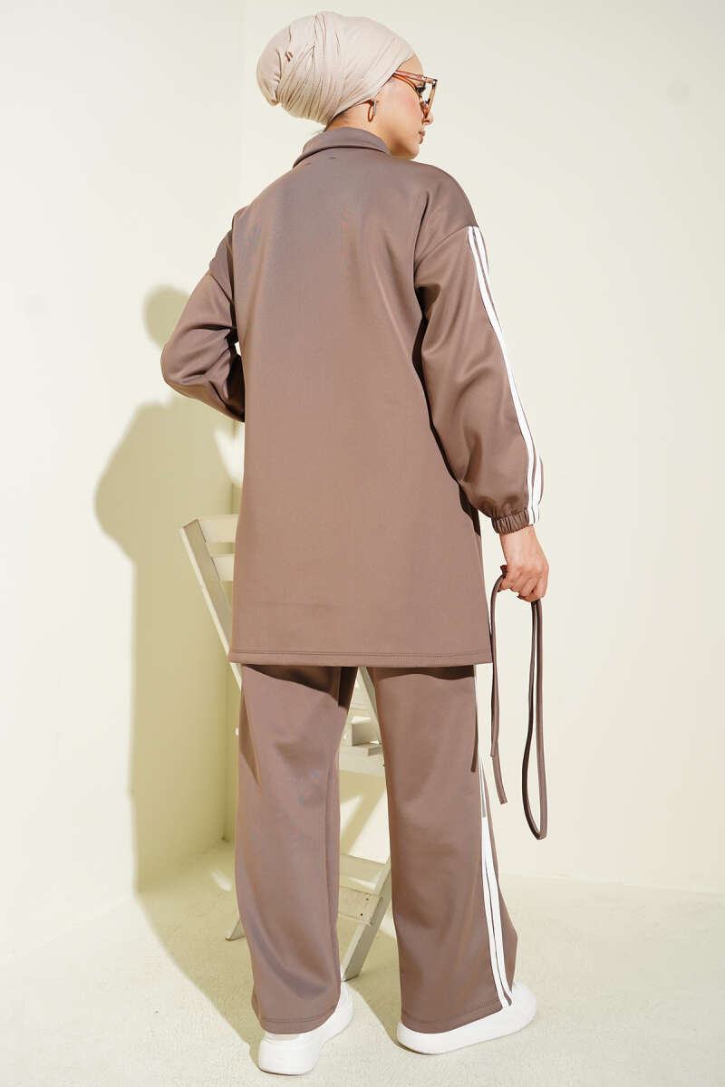 Kol Şeritli Düğmeli Scuba İkili Takım Kahve