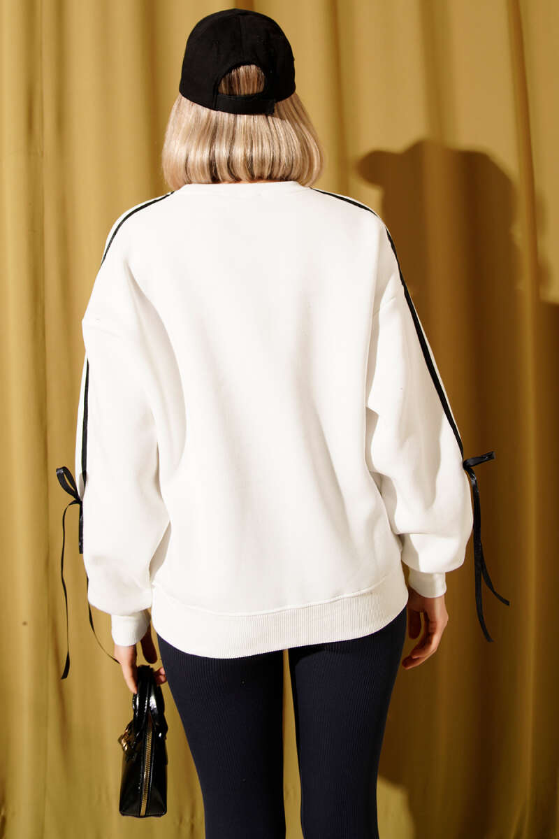 Kol Şeritli Fiyonklu Üç İplik Sweatshirt Siyah