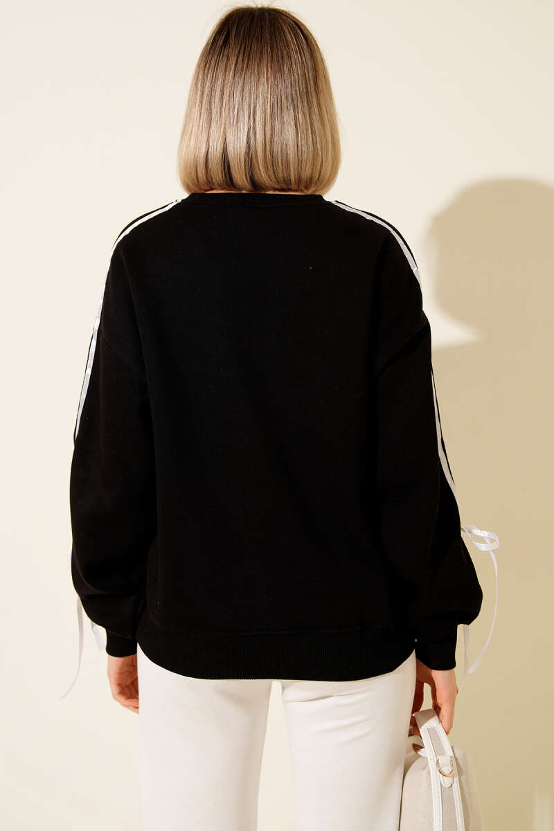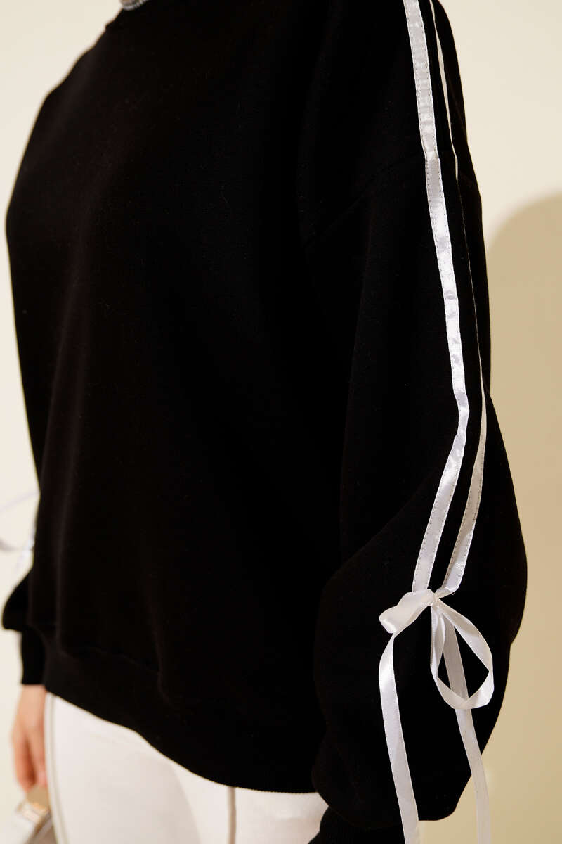 Kol Şeritli Fiyonklu Üç İplik Sweatshirt Lacivert