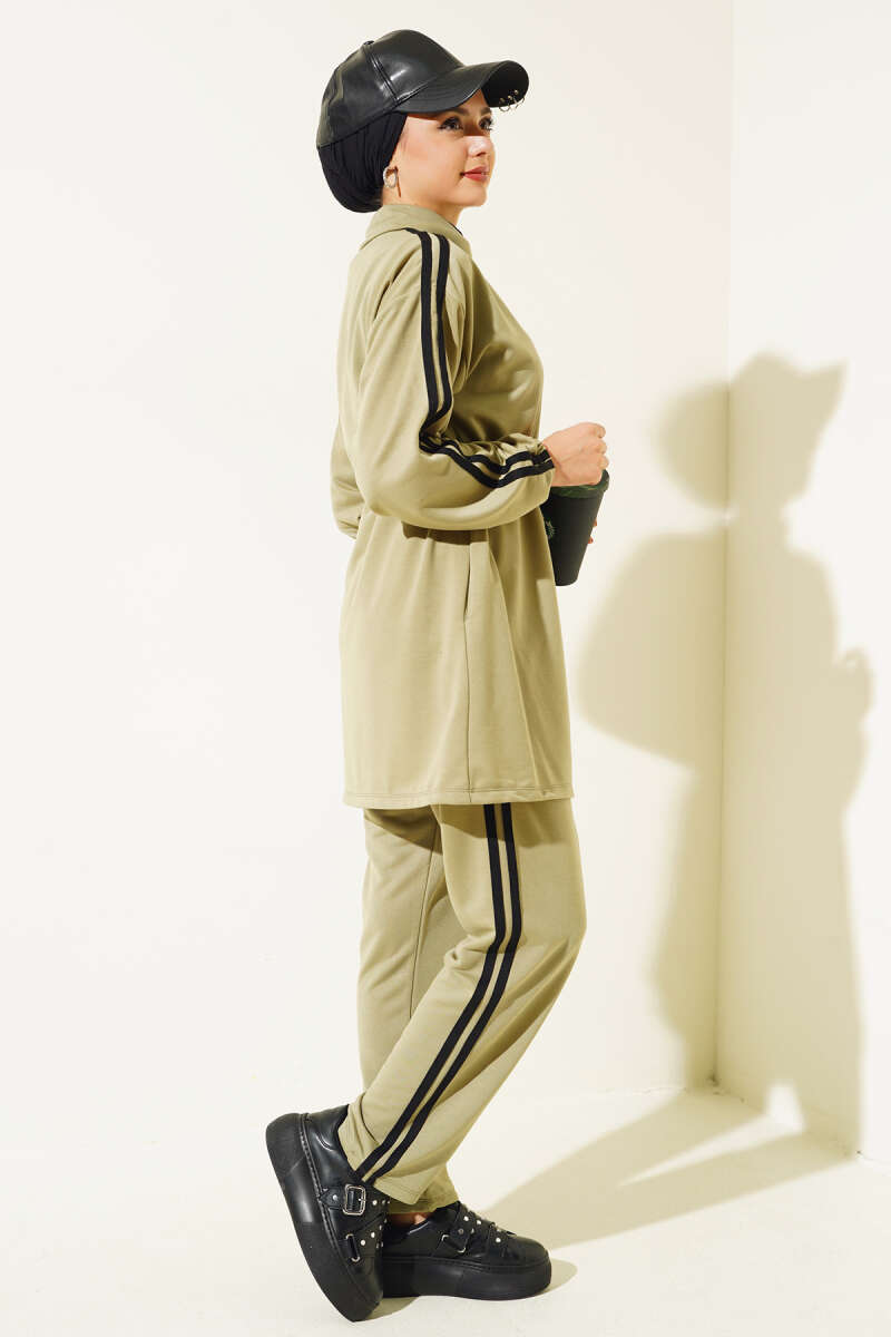 İnce Çizgili Triko Jileli İkili Takım Bej