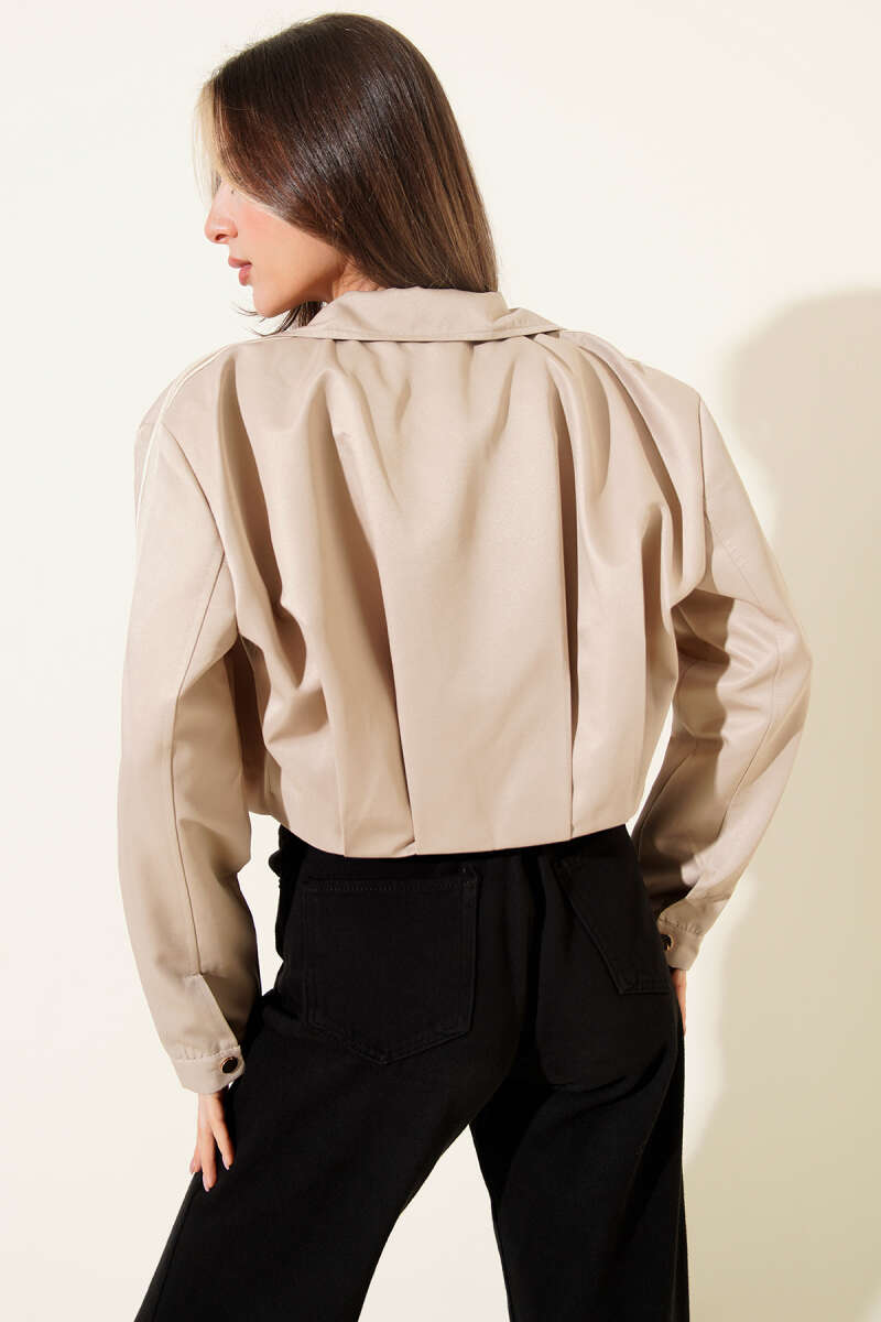 Torba Cepli Ribanalı Kısa Deri Ceket Bej
