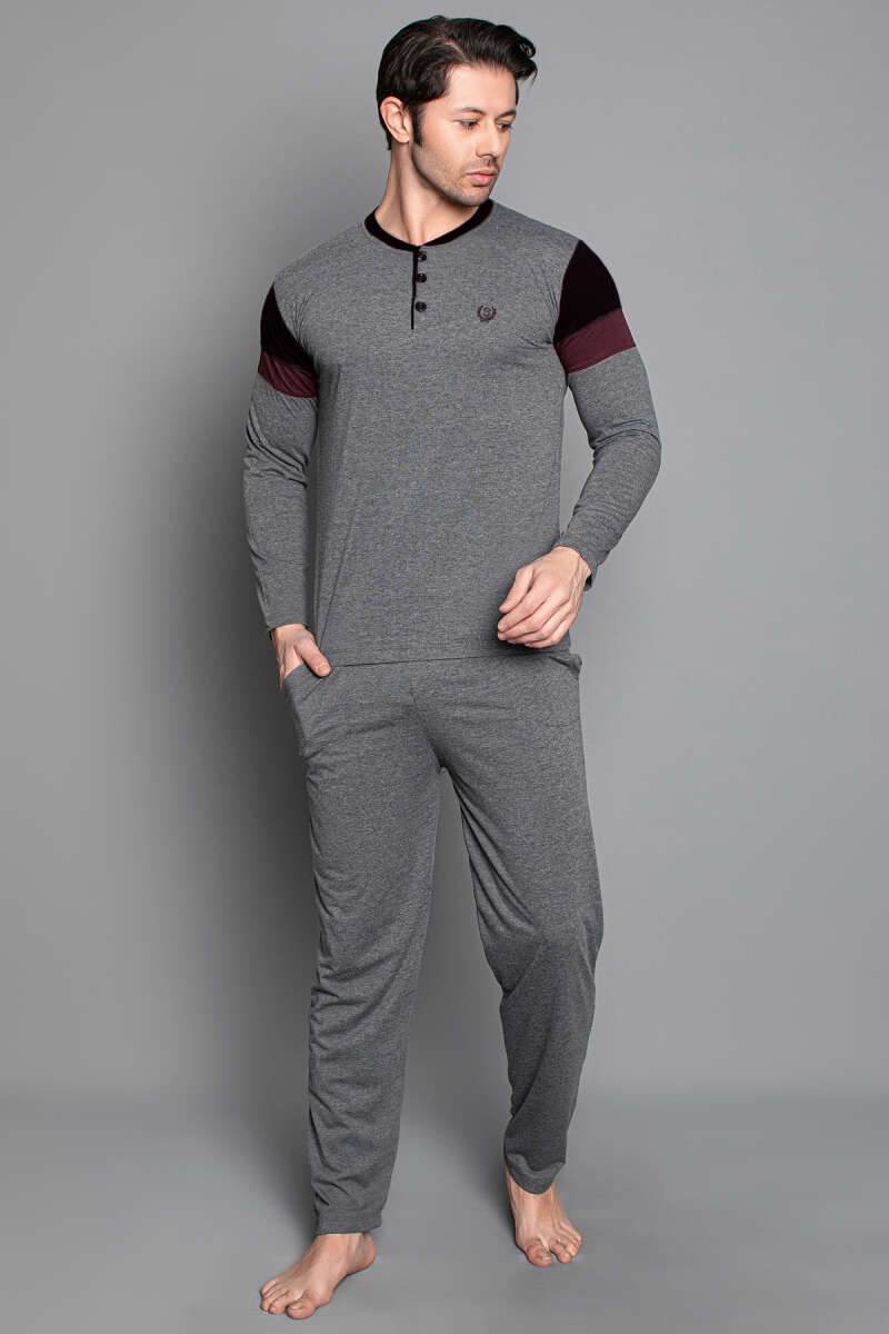 Kol Şeritli Uzun Kol Erkek Pijama Takımı Füme Siyah