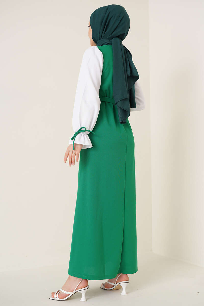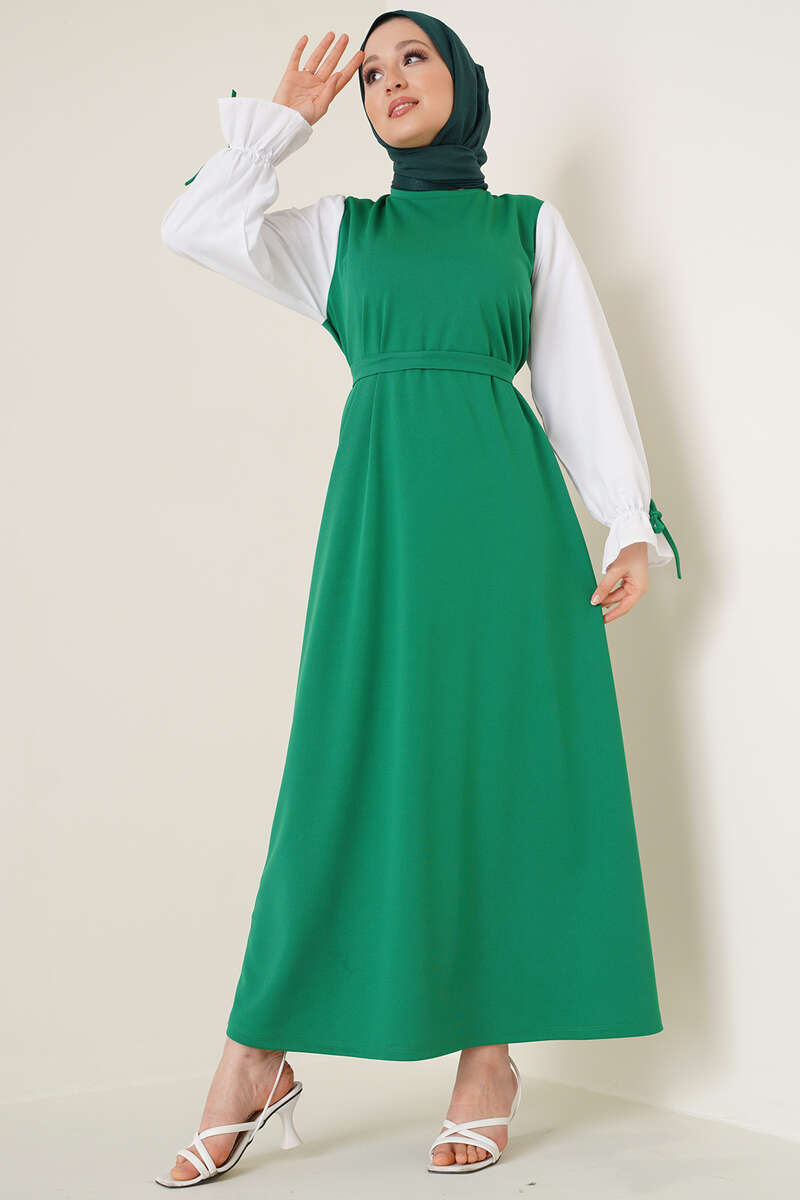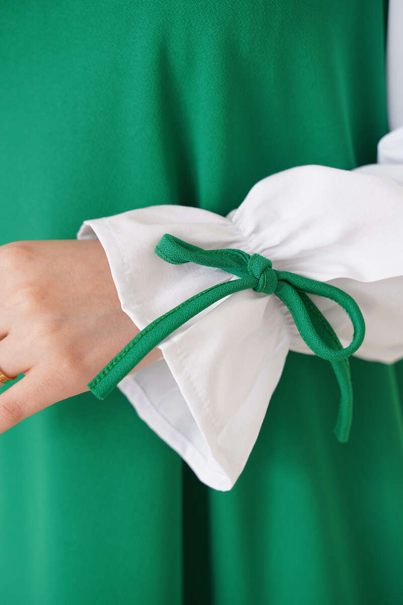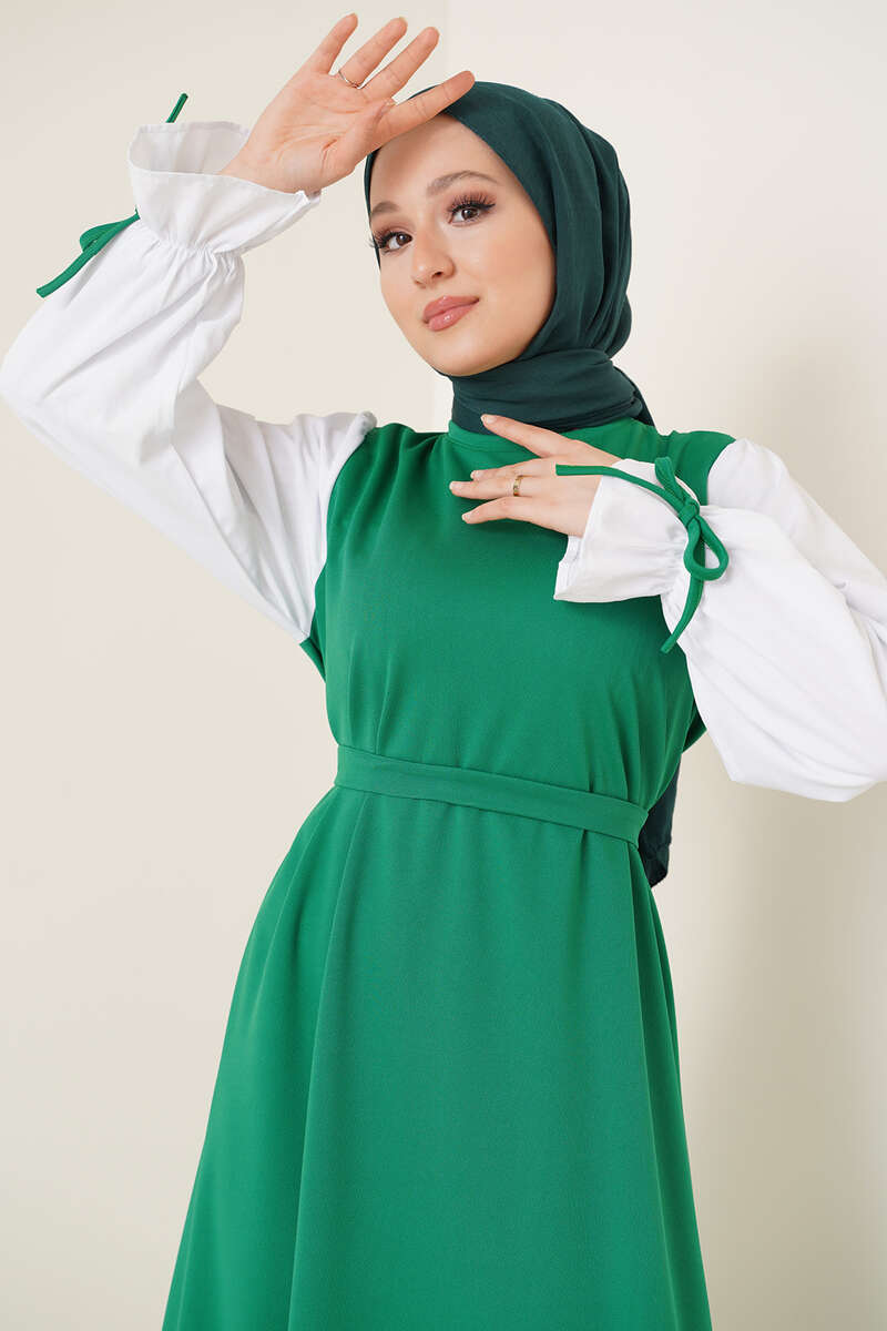 Yeni sezon garnili elbise sizlerle. Bisiklet yakalıdır kolları lastikli olup bileğinde ip detayı bulunmaktadır. Garnili modeldir balon kolludur.