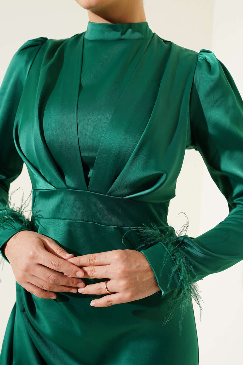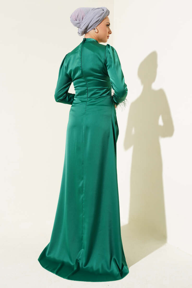 Kol Ucu Püsküllü Saten Abiye Elbise Yeşil