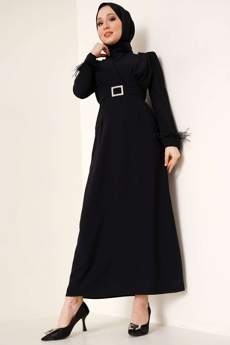 Yeni sezon elbisemiz dikkat çeken şık tasarımıyla sizler için geldi. Elbisemizin kol uçları tüylüdür. Kemer tokası ve kuşağı bulunmaktadır. Sırtı fermuarlıdır. Her ortamda rahatlıkla giyebilirsiniz. Farklı renk seçenekleri mevcuttur.