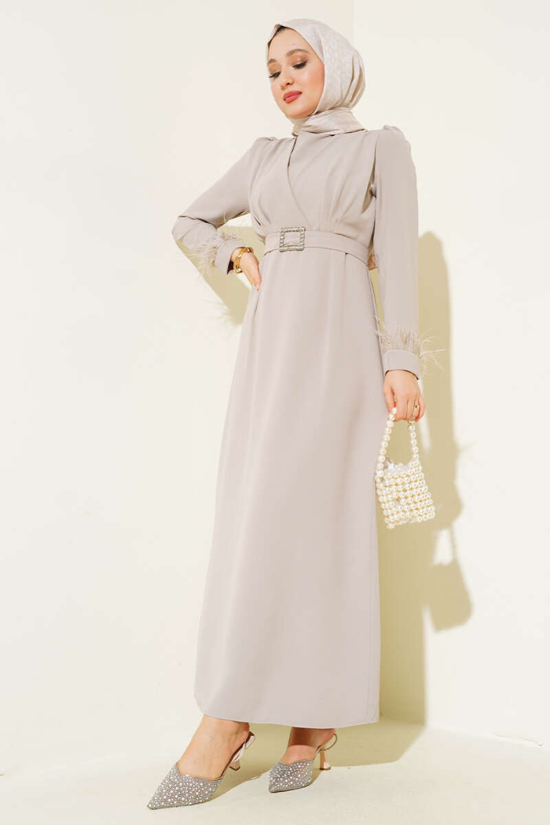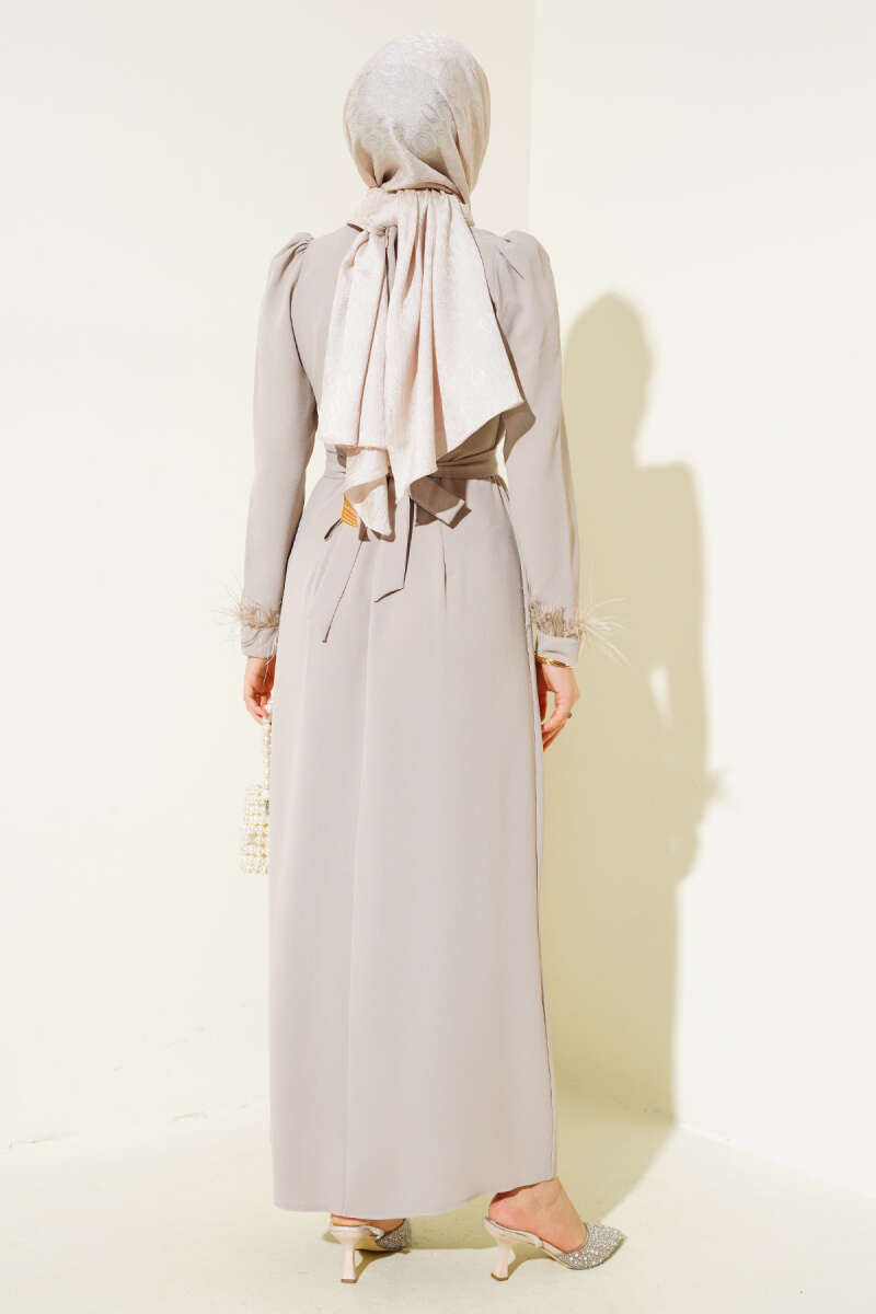 Metal Düğme Süslemeli Bağcıklı Elbise Vizon