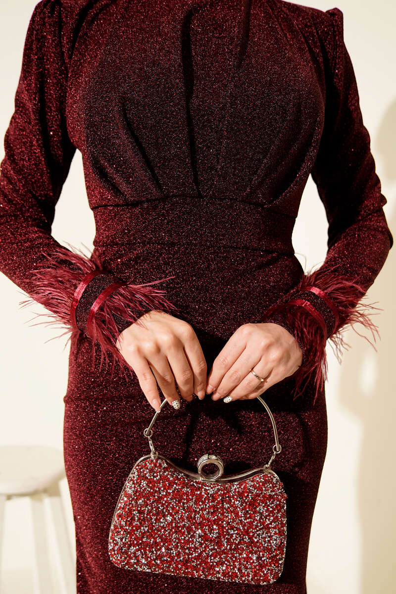 Kol Ucu Tüylü Simli Abiye Elbise Zümrüt Yeşili