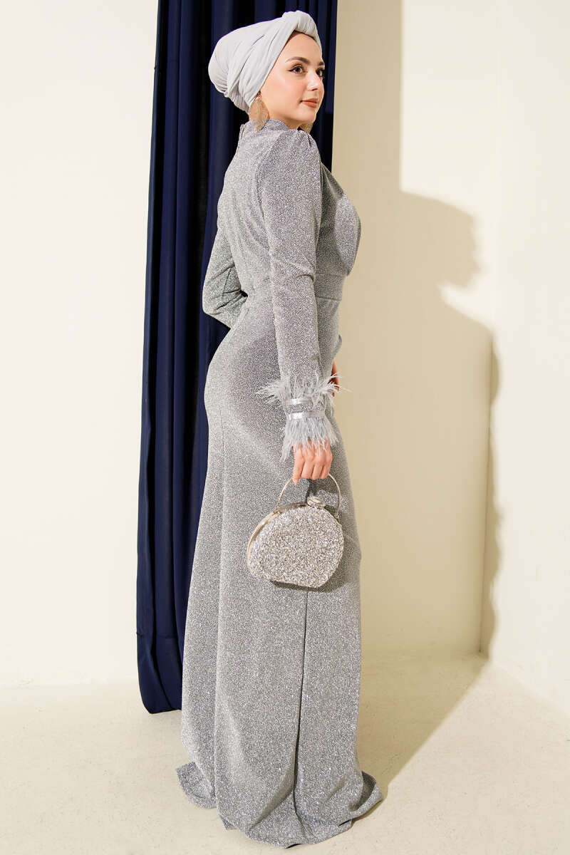 Kol Ucu Tüylü Simli Abiye Elbise Zümrüt Yeşili