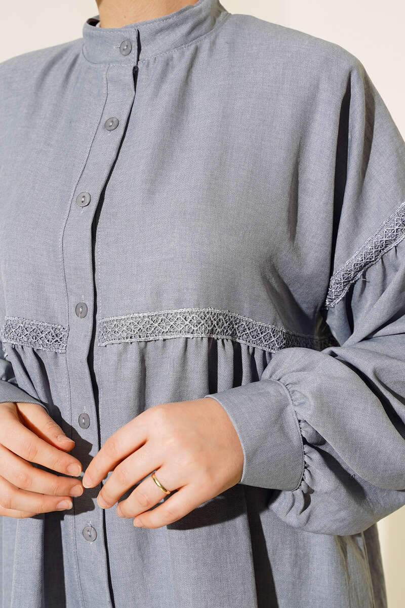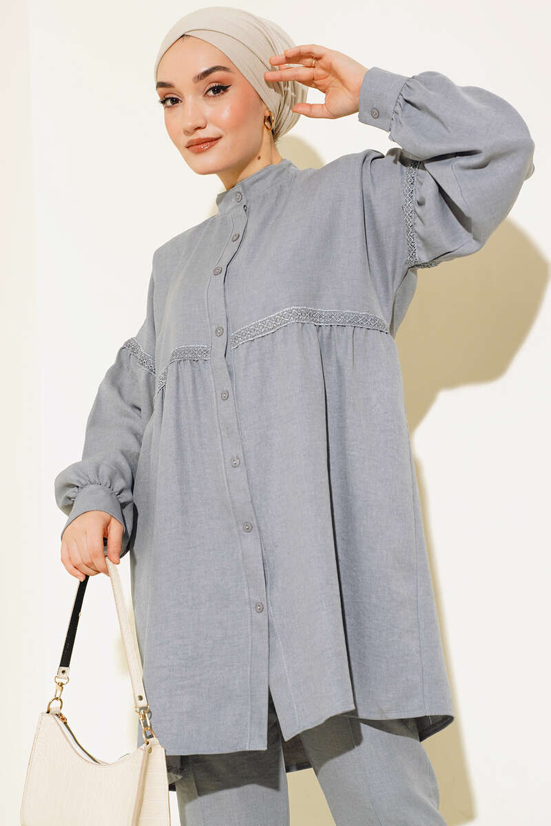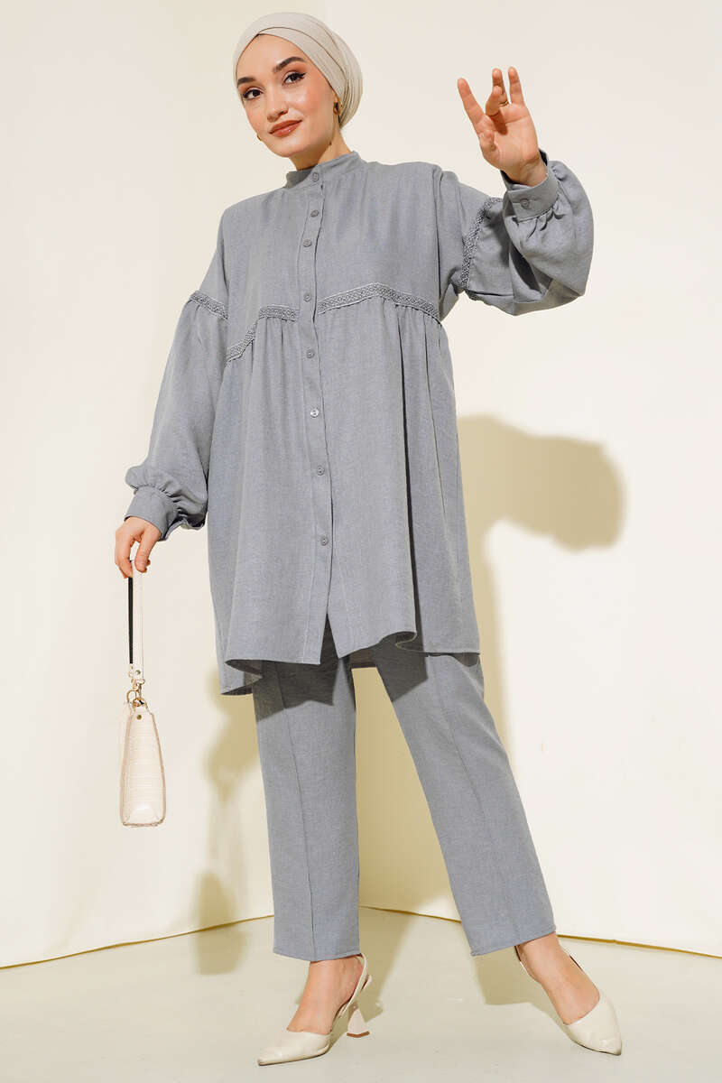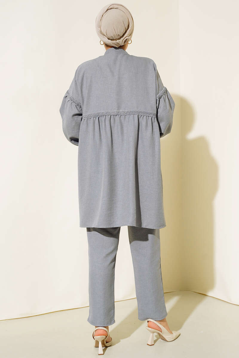 Kol Ve Önü Dantelli Keten İkili Takım Gri