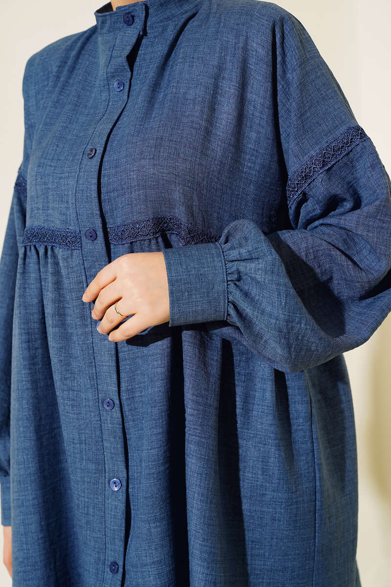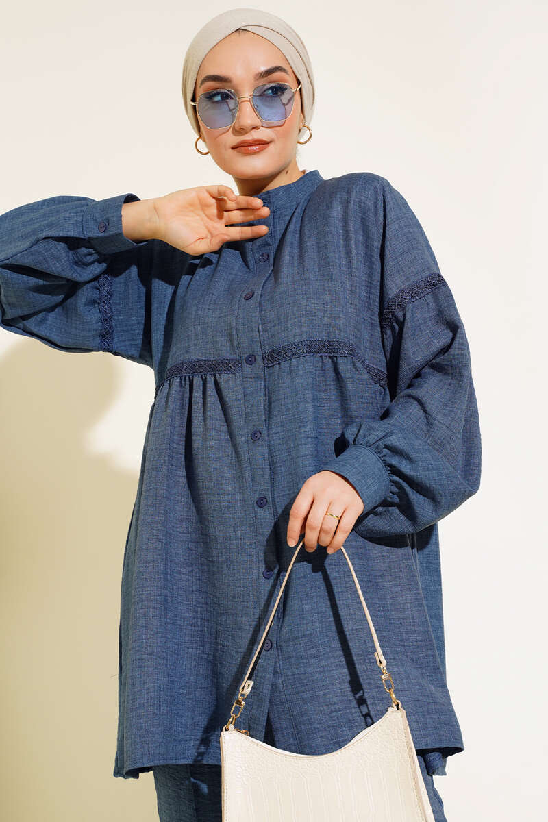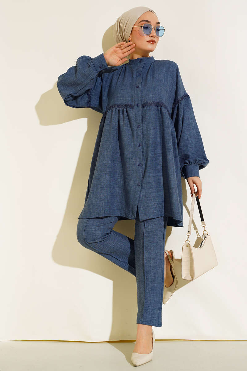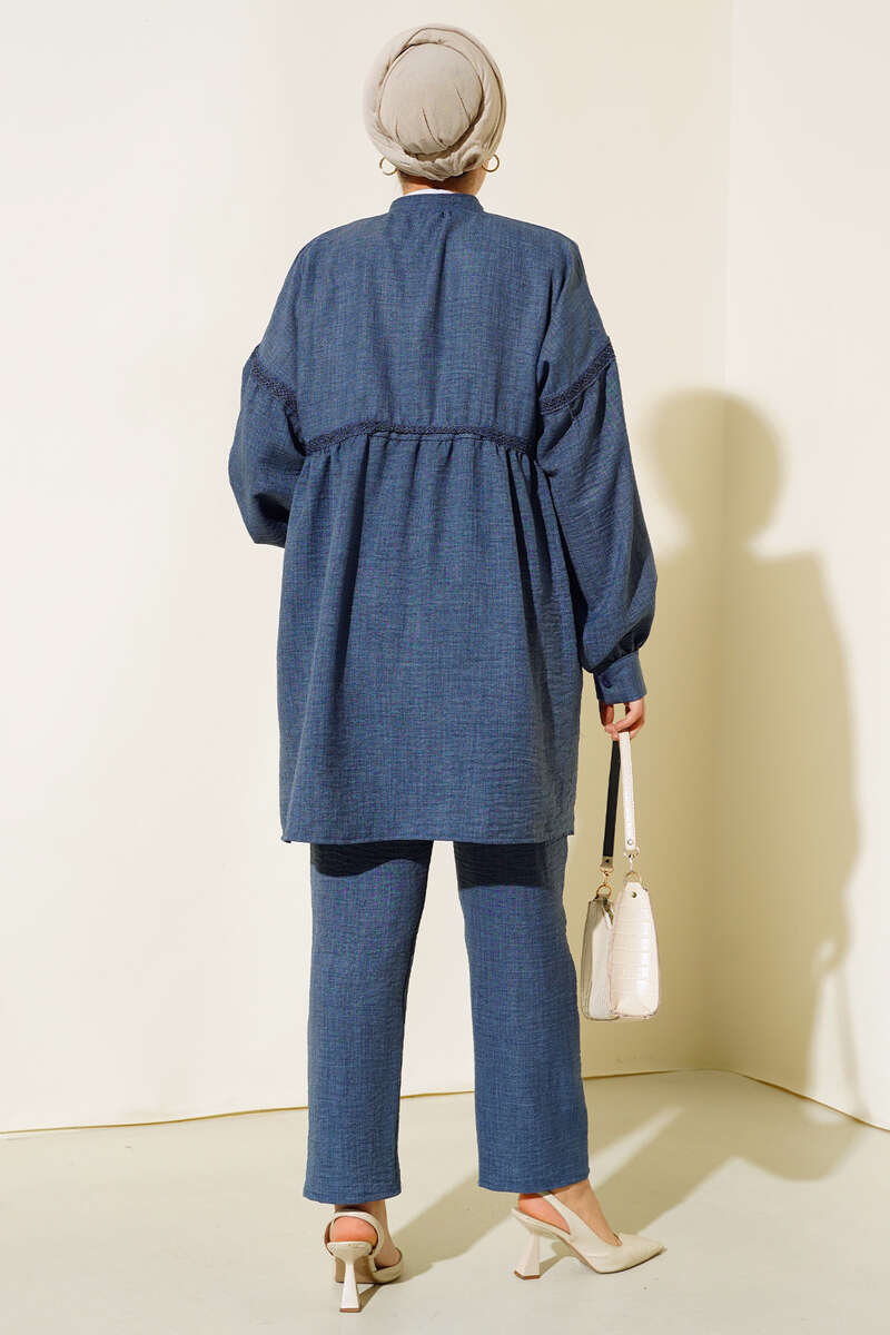 Kol Ve Önü Dantelli Keten İkili Takım İndigo