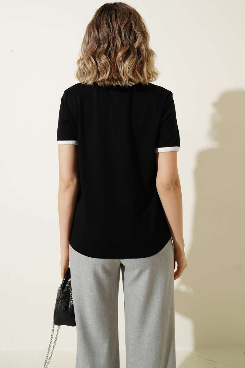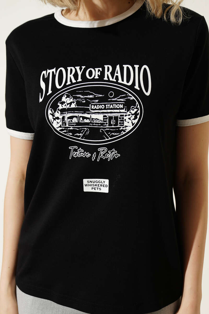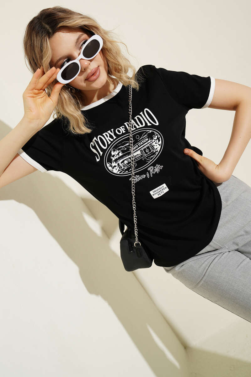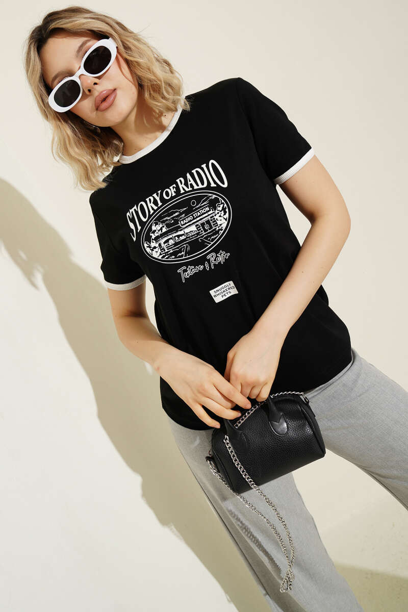 Kol Ve Yaka Biyeli Yazılı T-shirt Siyah