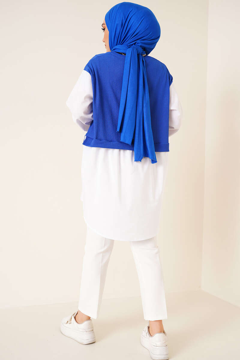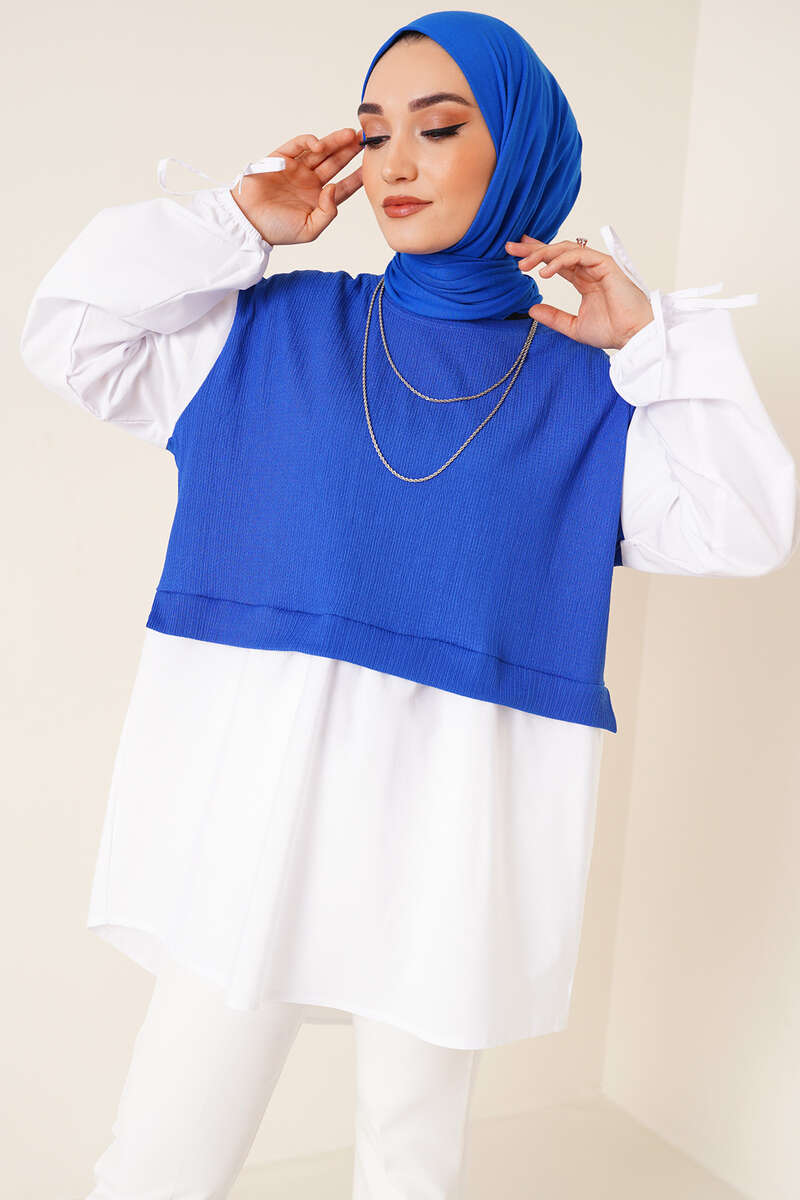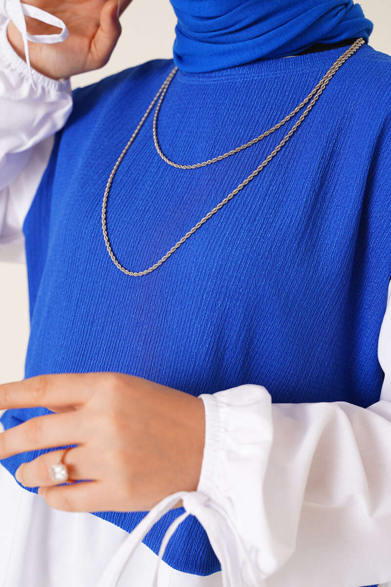 Tuniğimiz yeni sezon modeldir. Tuniğimizin arkası önünden  biraz daha uzundur. Bisiklet yaka olan tuniğimiz garnili model olup kolları beyazdır. Bilekleri lastikli olan tuniğimizin biklerinde bağlama ipleri bulunmaktadır.