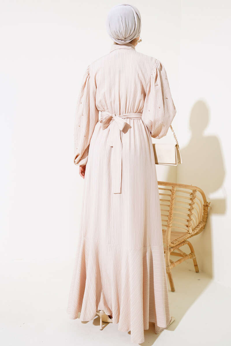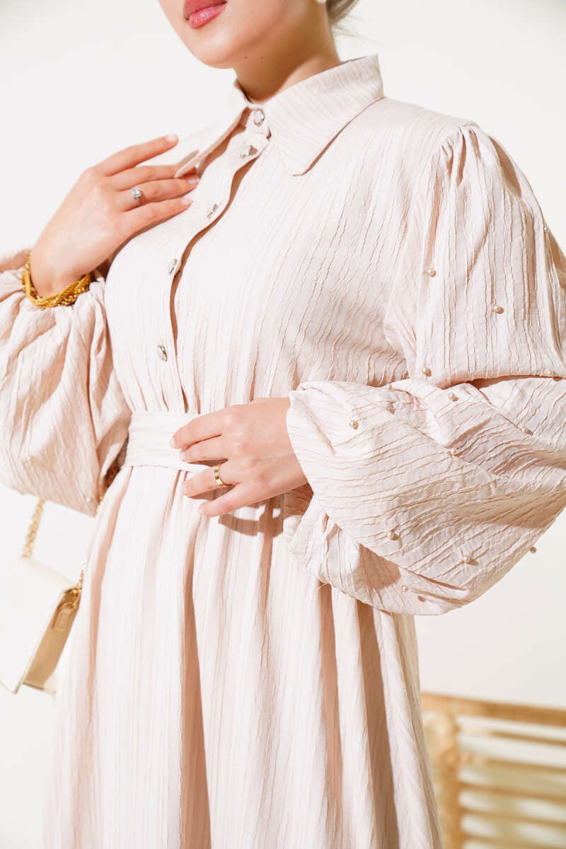 Yeni sezon boydan düğmeli elbisemiz bu yaz favoriniz olacak. Elbisemizin kolları boncuk taş detaylarıyla süslenmiştir. Bilekleri gipeli olan elbisemizin kendi kumaşından kuşağı bulunmaktadır. Önü düğmeli olan elbisemizin cepleri mevcuttur.