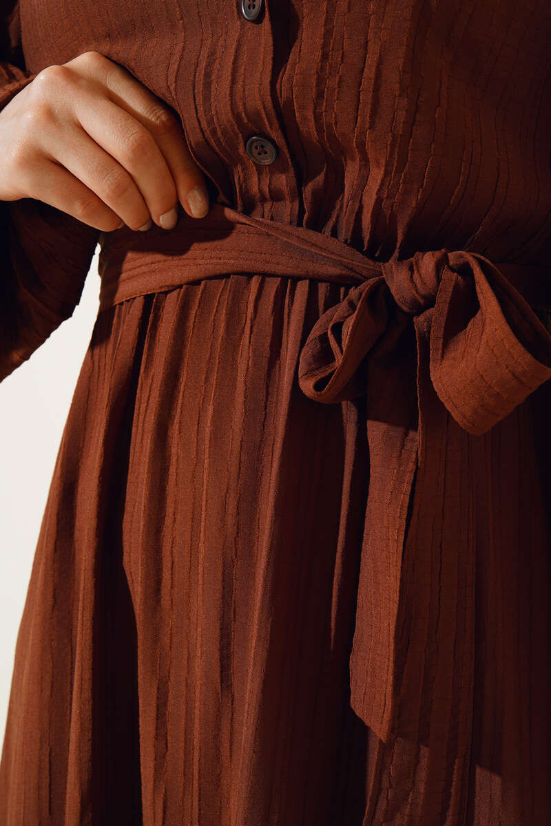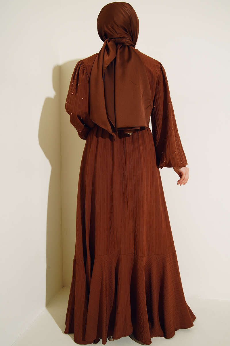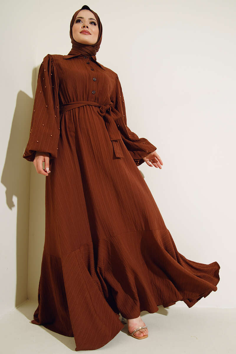 Kolları Boncuk Detaylı Kuşaklı Elbise Kahve