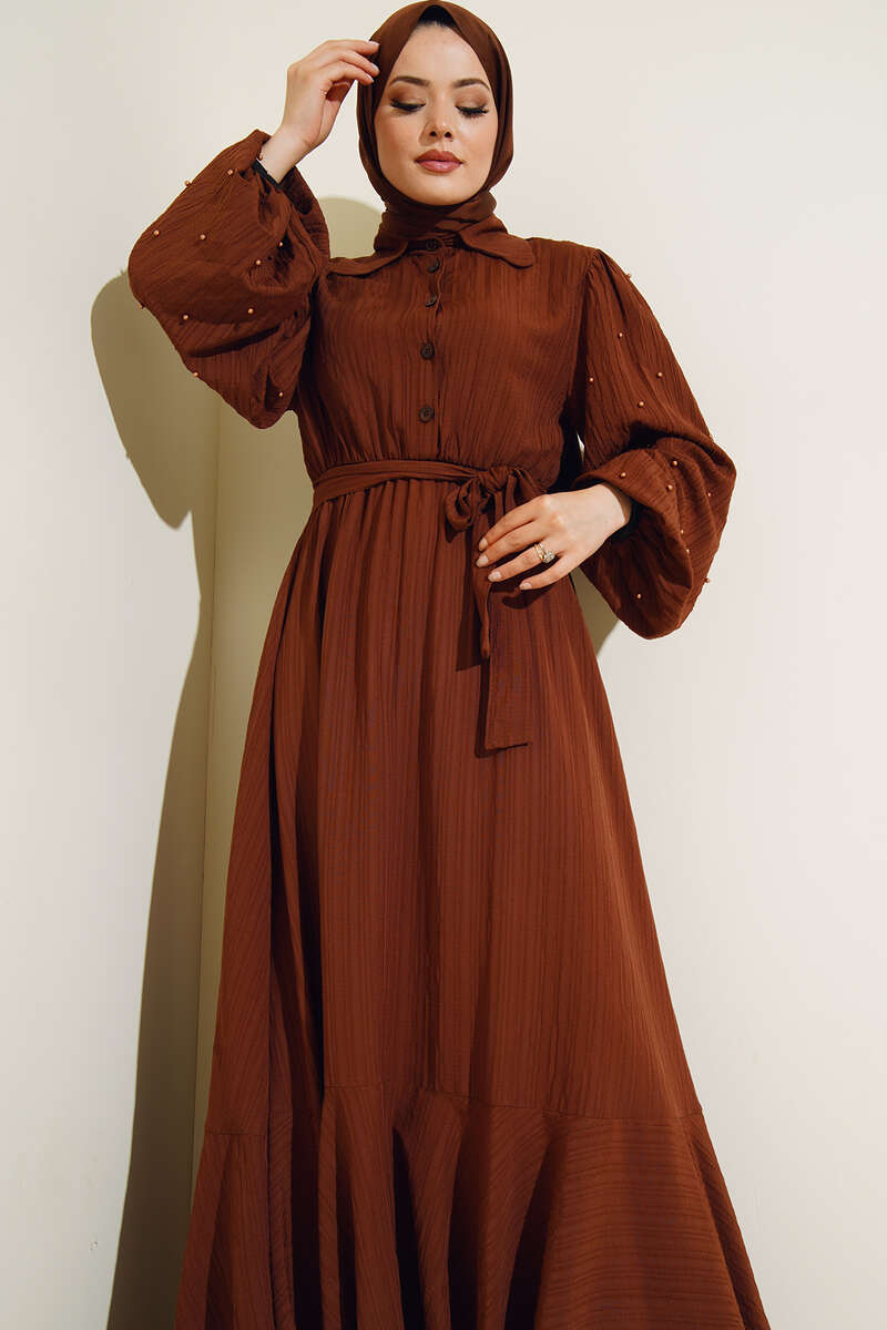 Yeni sezon boydan düğmeli elbisemiz bu yaz favoriniz olacak. Elbisemizin kolları boncuk taş detaylarıyla süslenmiştir. Bilekleri gipeli olan elbisemizin kendi kumaşından kuşağı bulunmaktadır. Önü düğmeli olan elbisemizin cepleri mevcuttur.