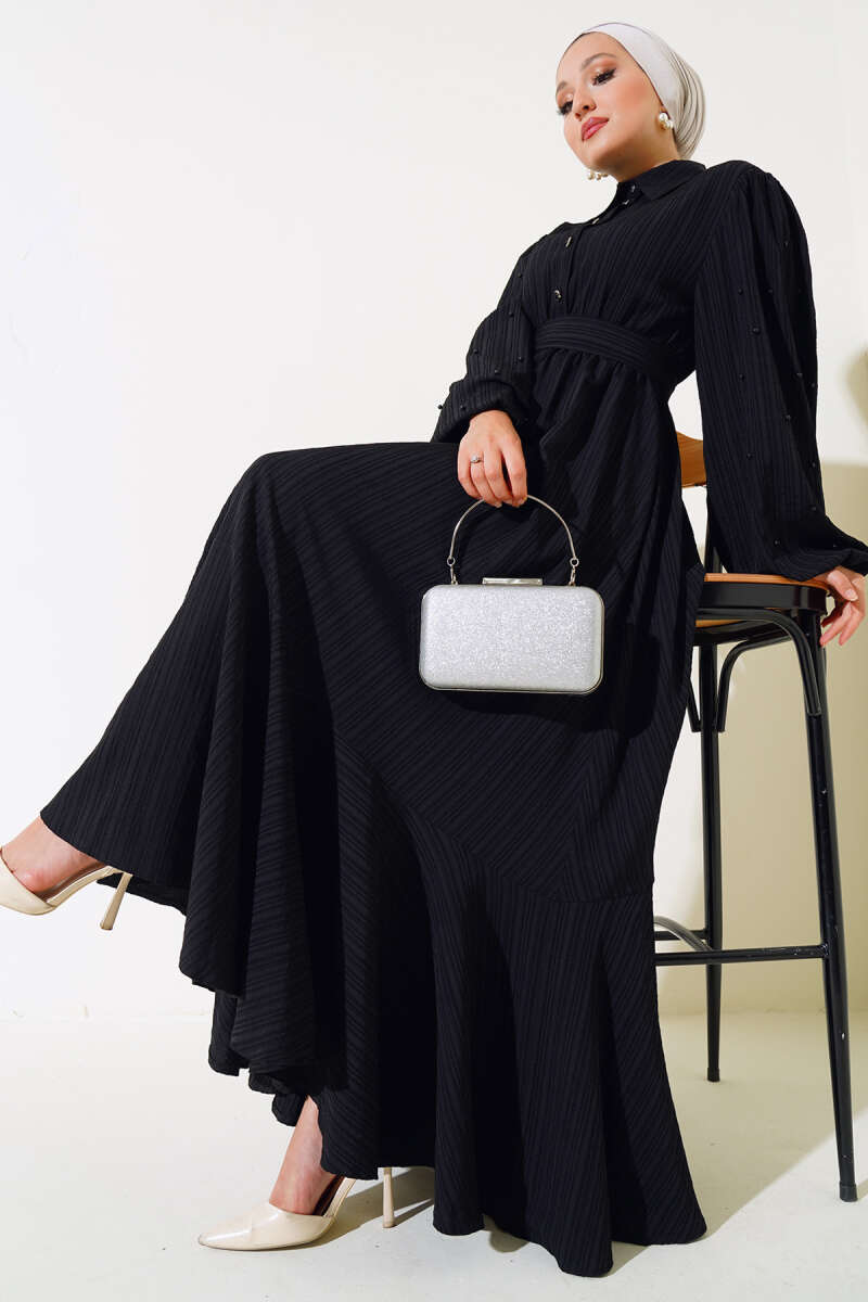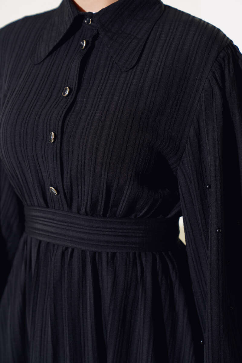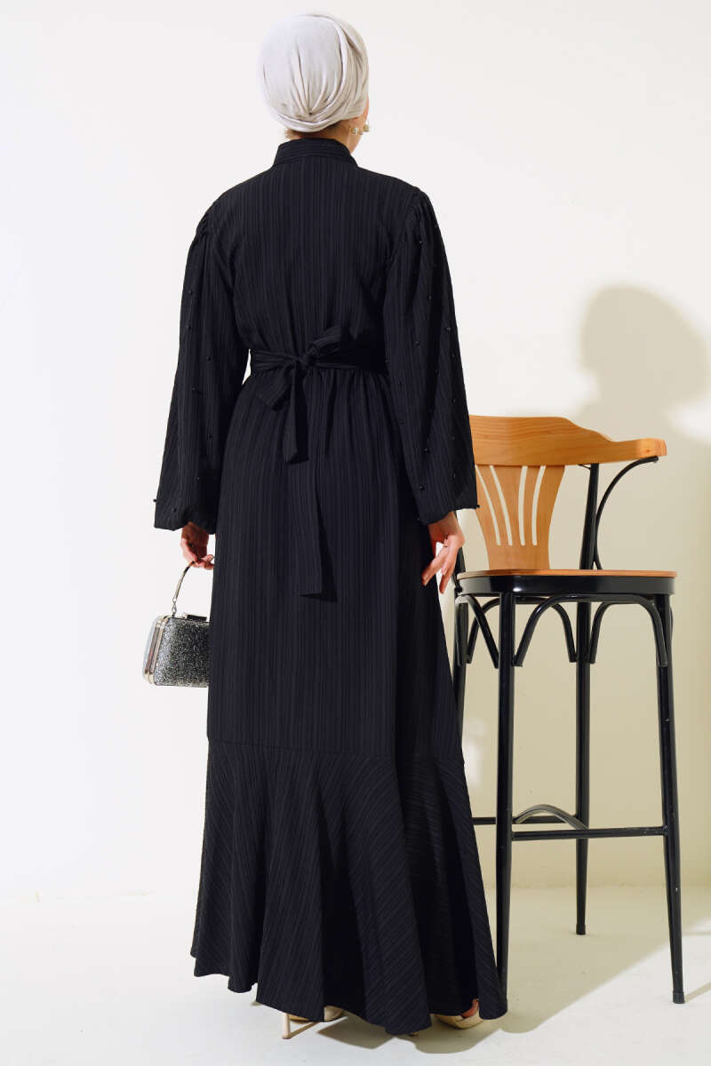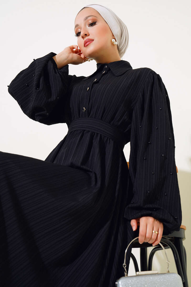 Kolları Boncuk Detaylı Kuşaklı Elbise Siyah