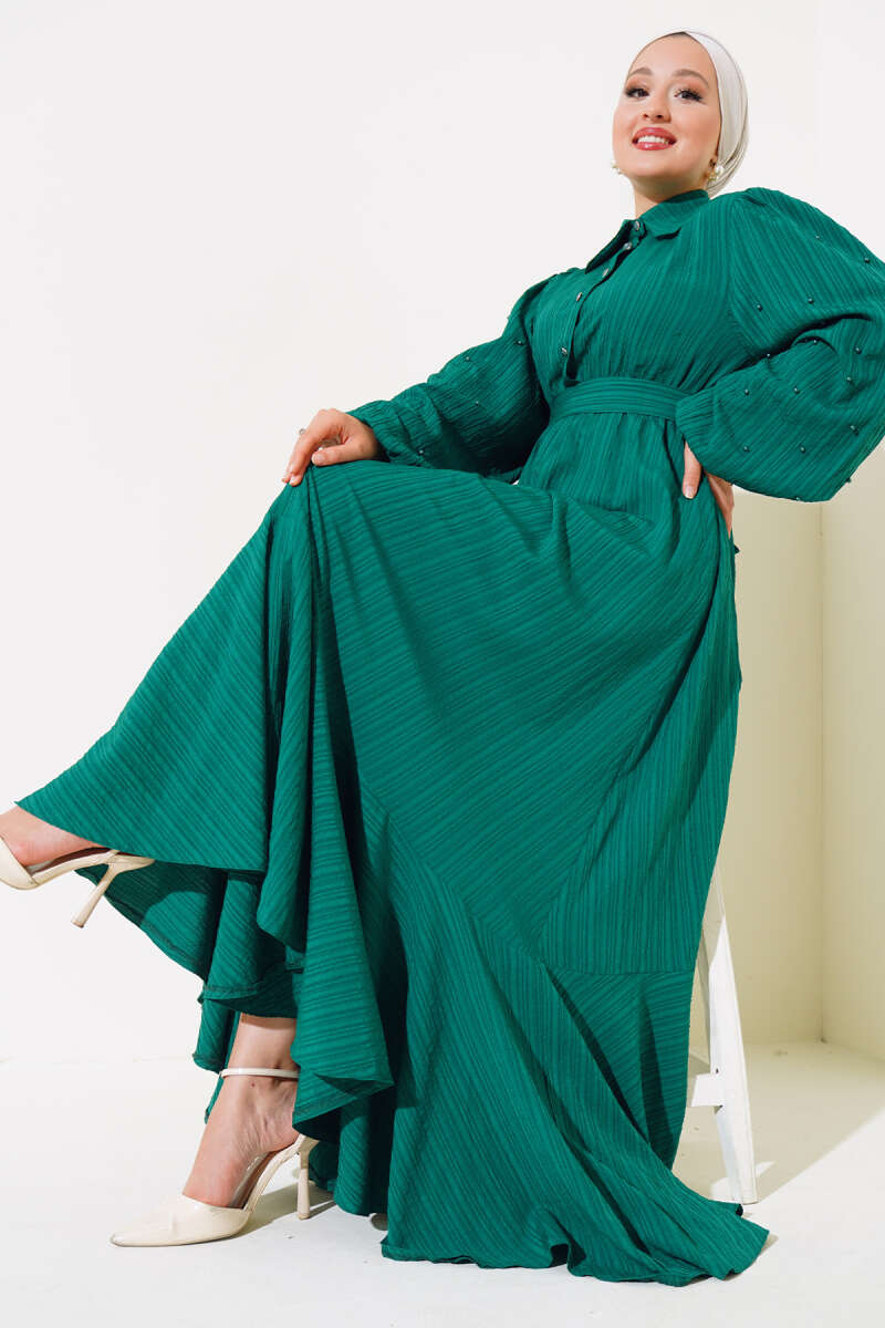Kolları Boncuk Detaylı Kuşaklı Elbise Zümrüt Yeşili