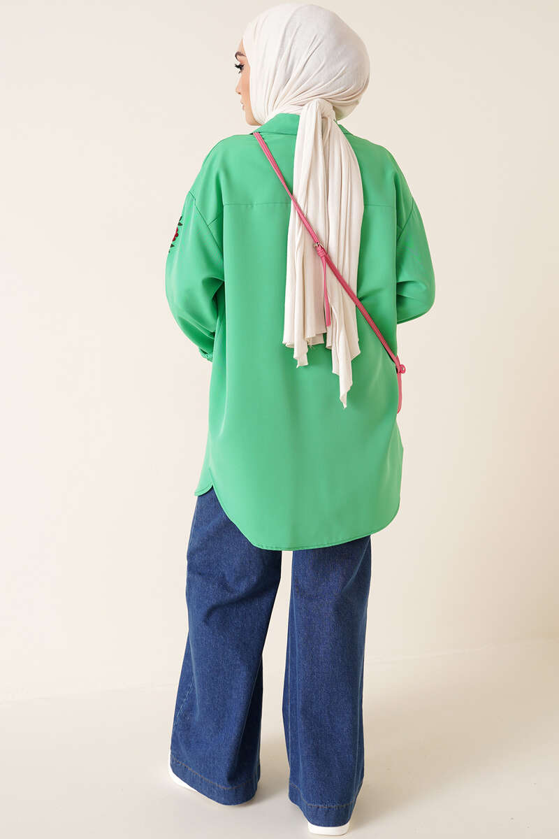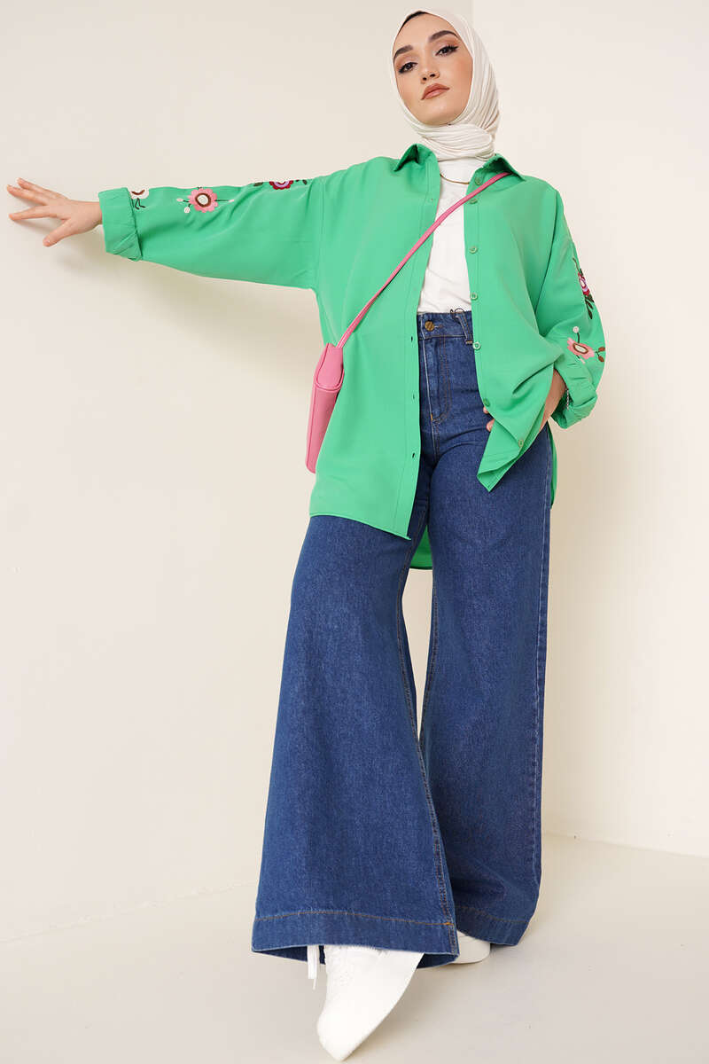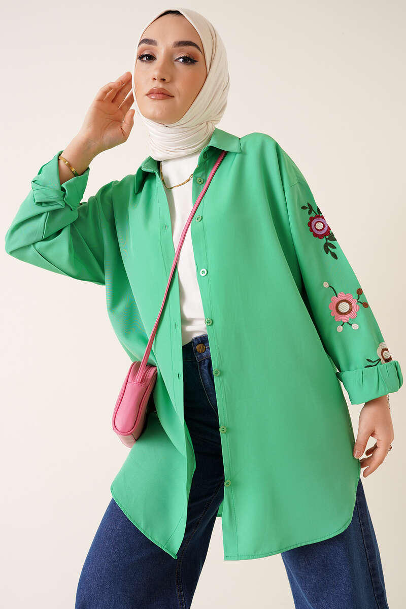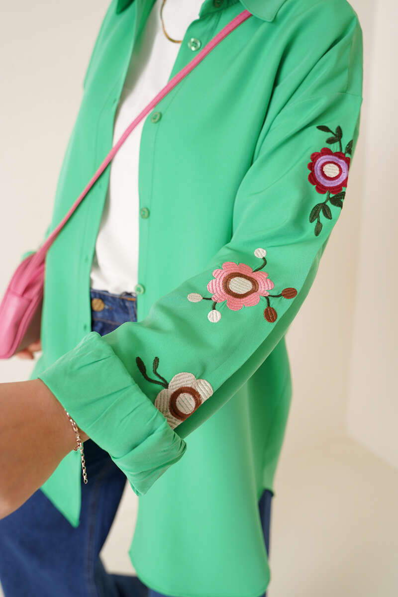 Yeni sezon gömleğimiz harika tasarımıyla sizler için geldi. Gömleğimizin kollarında renkli çiçek nakışları bulunmaktadır. Etek kısmı oval kesimdir. Önü ve bilekleri düğmelidir. Oldukça rahattır. Her kıyafetinizle rahatlıkla kombin yapabilirsiniz. Farklı renk seçenekleri mevcuttur.
