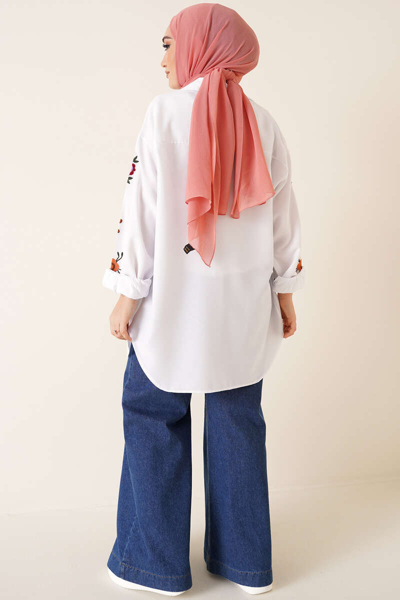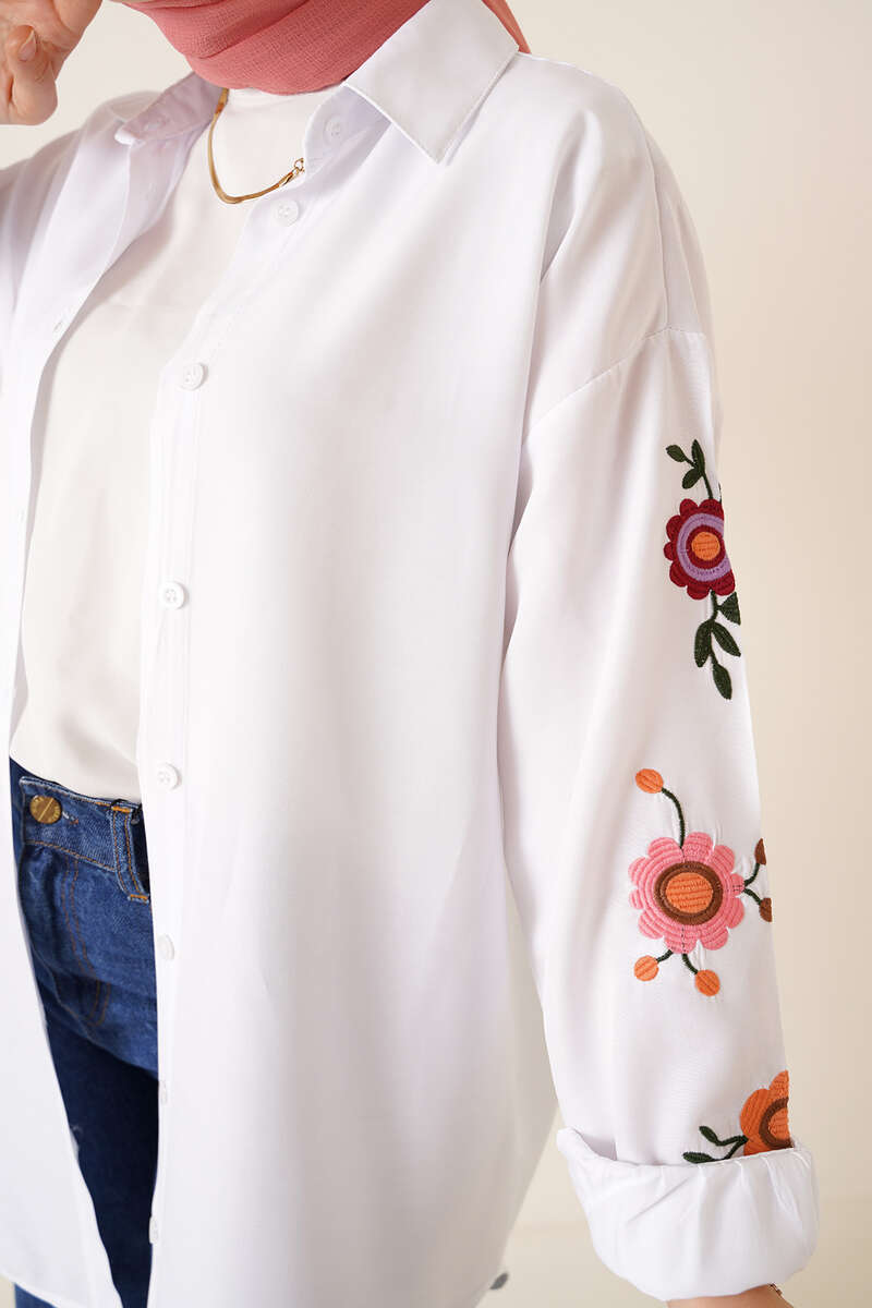 Yeni sezon gömleğimiz harika tasarımıyla sizler için geldi. Gömleğimizin kollarında renkli çiçek nakışları bulunmaktadır. Etek kısmı oval kesimdir. Önü ve bilekleri düğmelidir. Oldukça rahattır. Her kıyafetinizle rahatlıkla kombin yapabilirsiniz. Farklı renk seçenekleri mevcuttur.