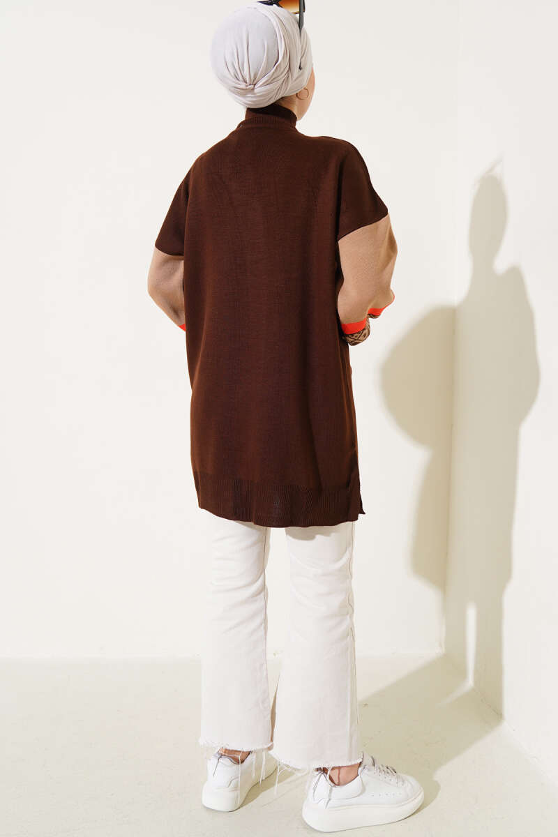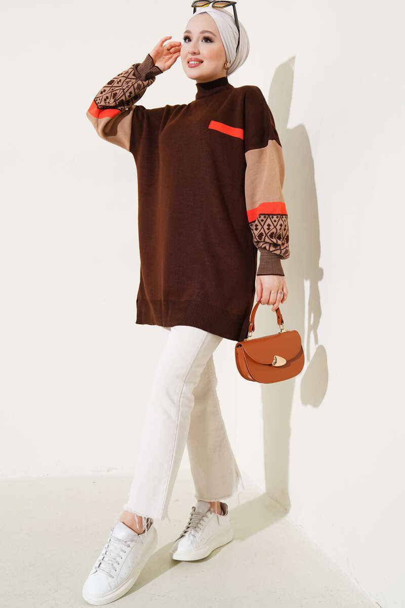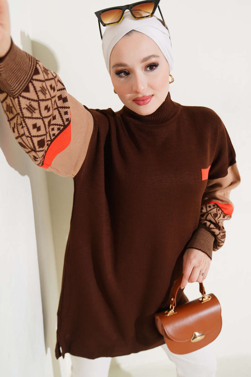 Kolları Desenli Balıkçı Yaka Triko Tunik Kahve Ekru