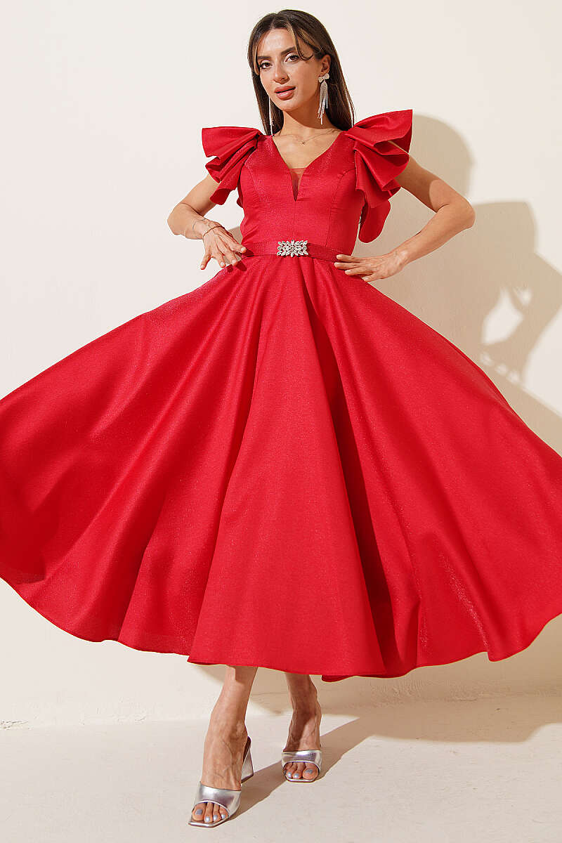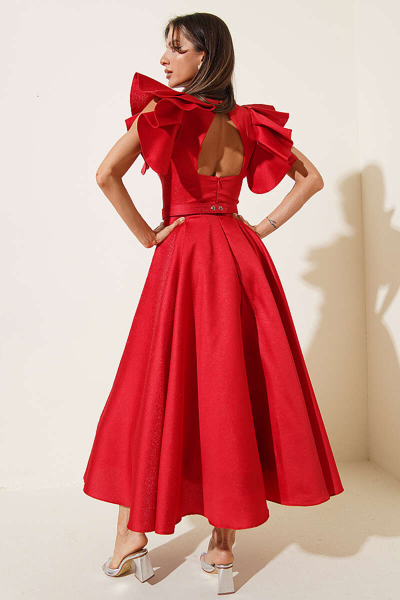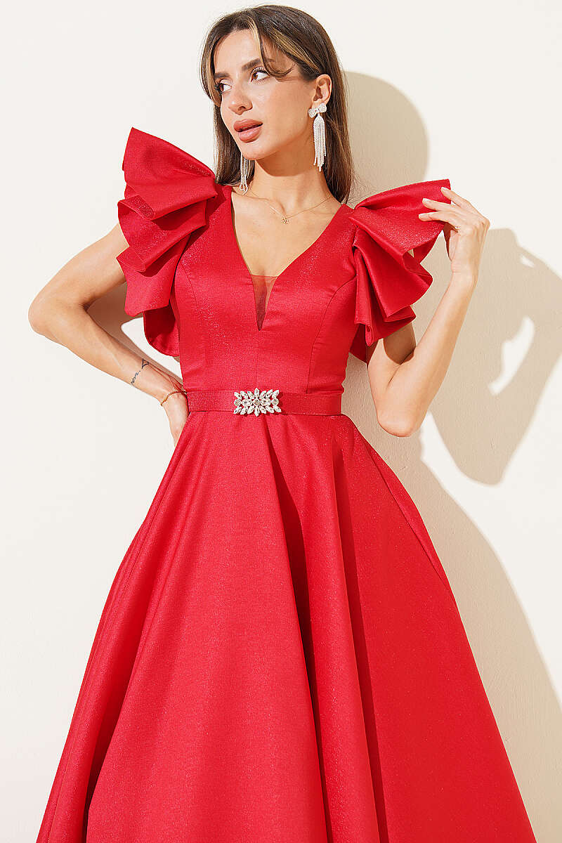 Kolları Fırfır Detaylı Abiye Elbise Kırmızı