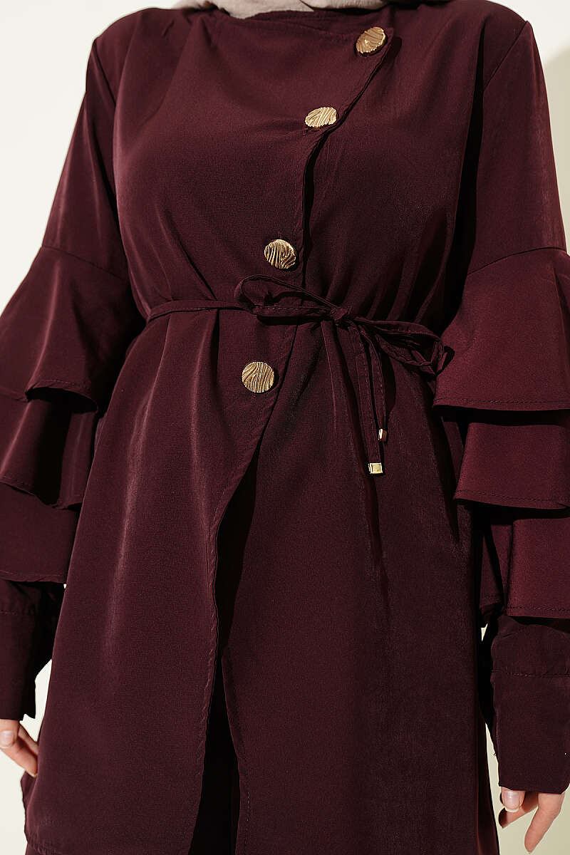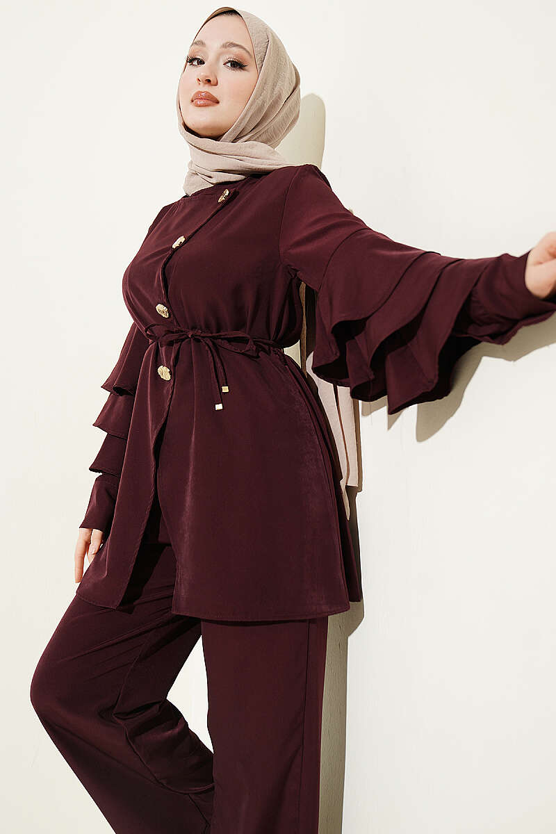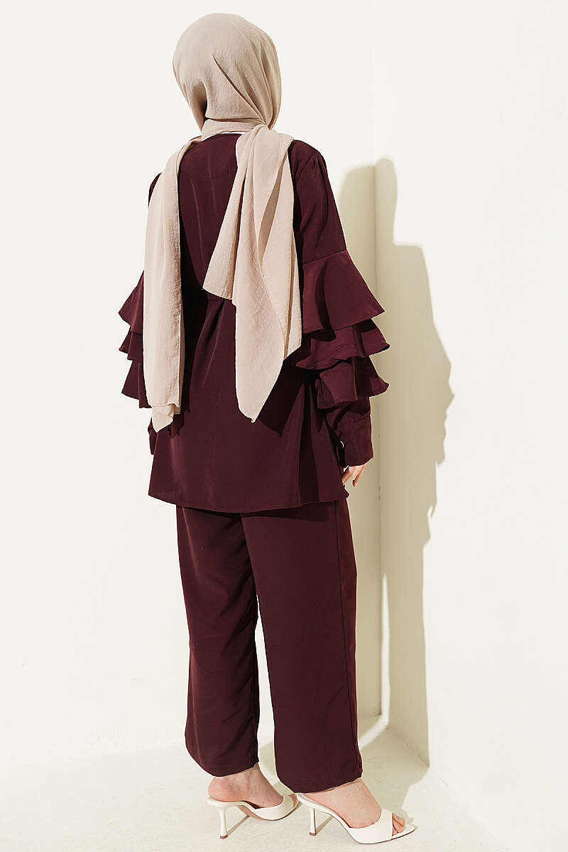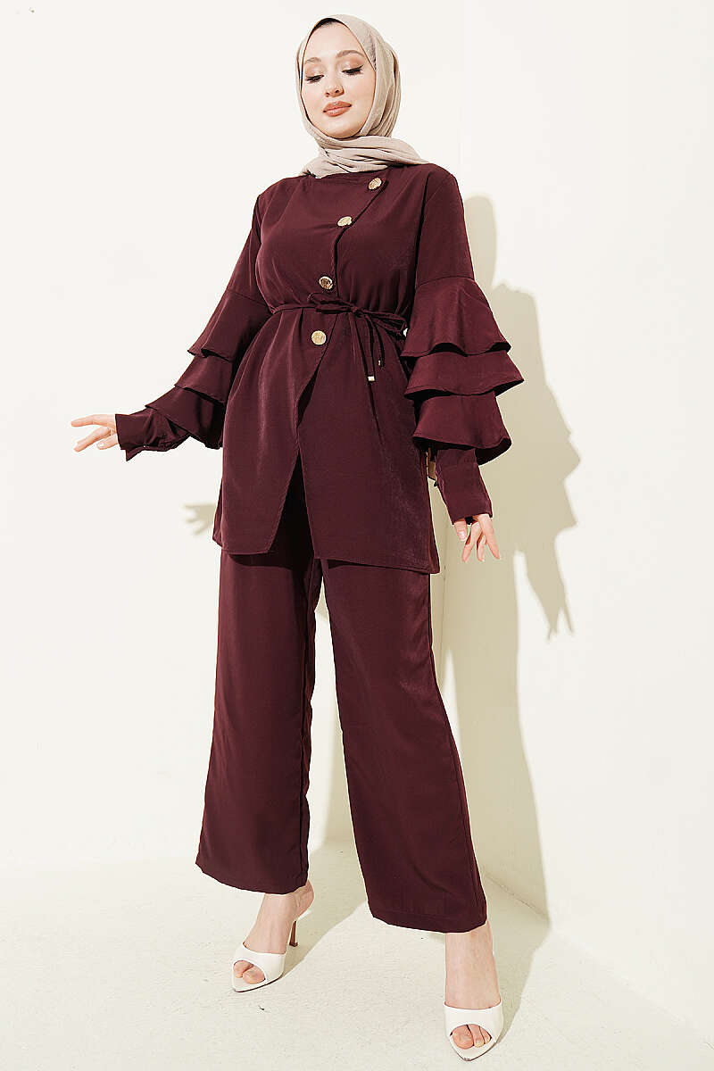 Kolları Fırfırlı Düğmeli İkili Takım Mürdüm