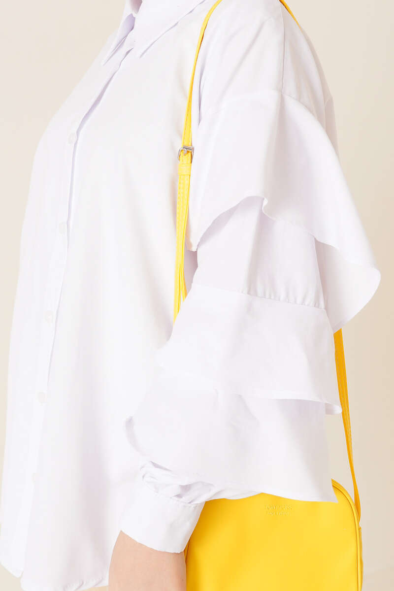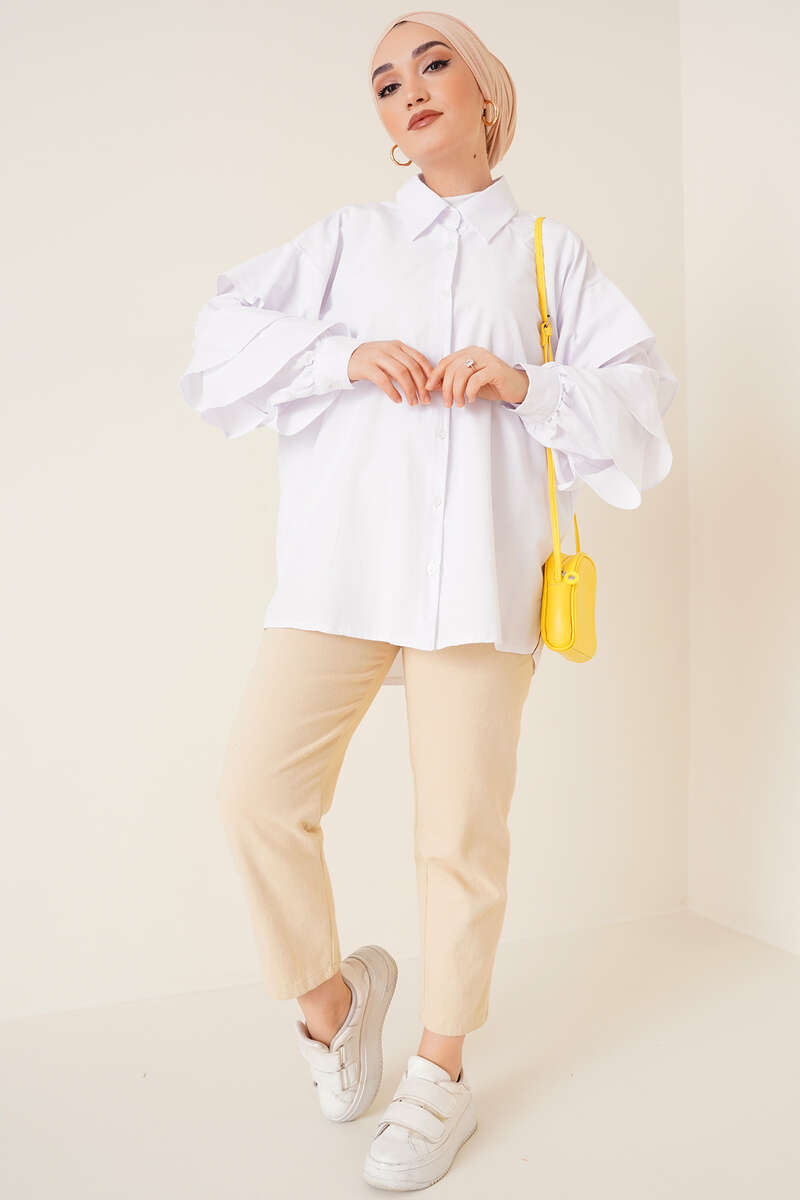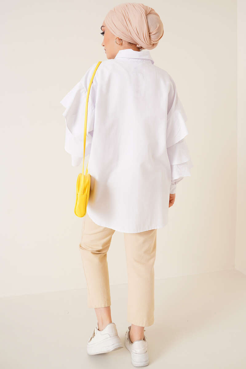 Yeni sezon gömleğimizin kolları kat kat görünümlüdür. Düşük omuz model olan gömeleğimizin etek ucunun arkası önünden uzundur. Kombinlerinzde tamamlayıcı parça olacak gömleğimiz şık duruşuyla sezonun favorileri arasında