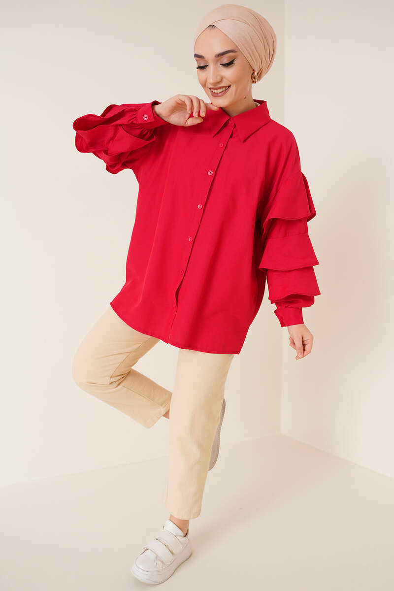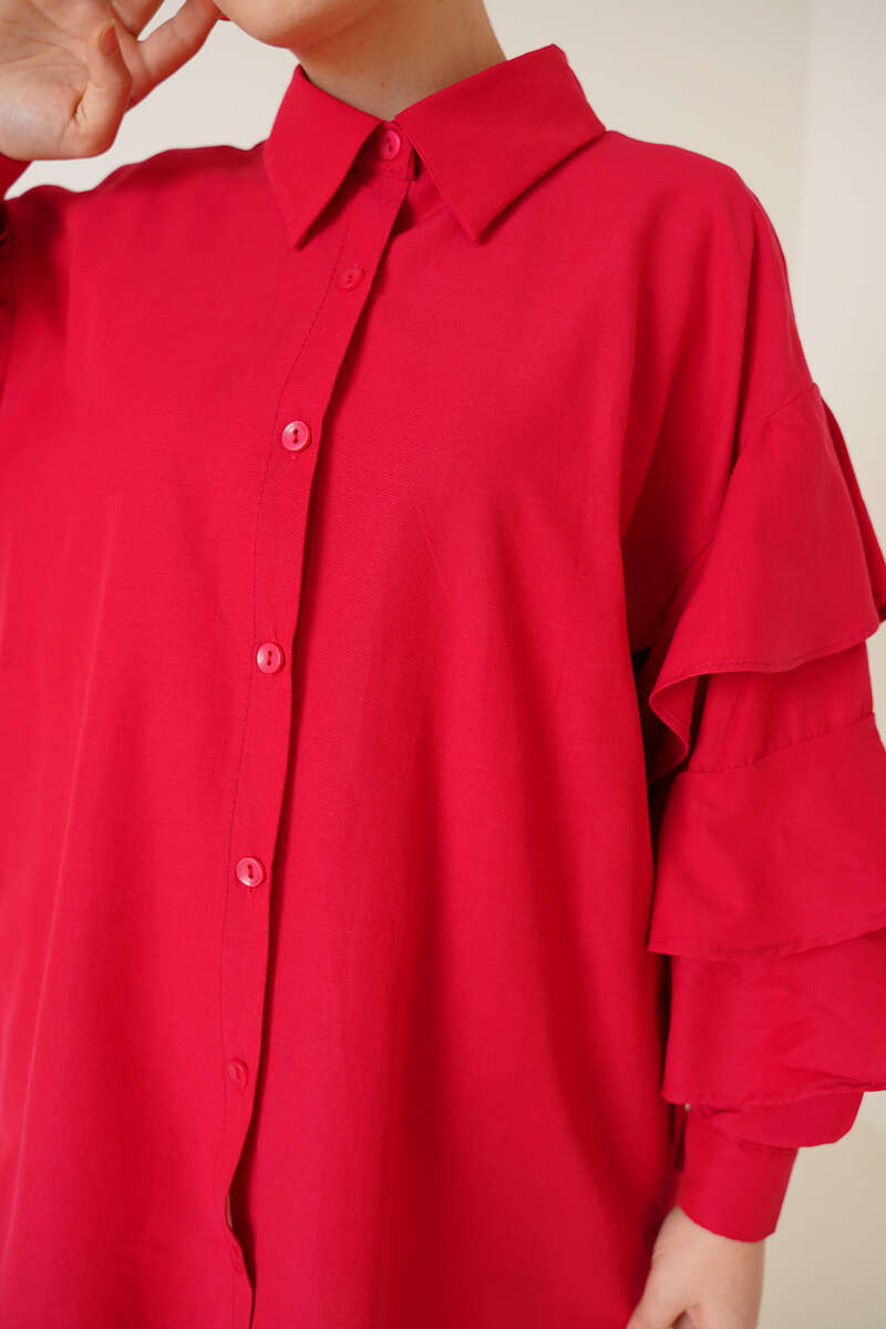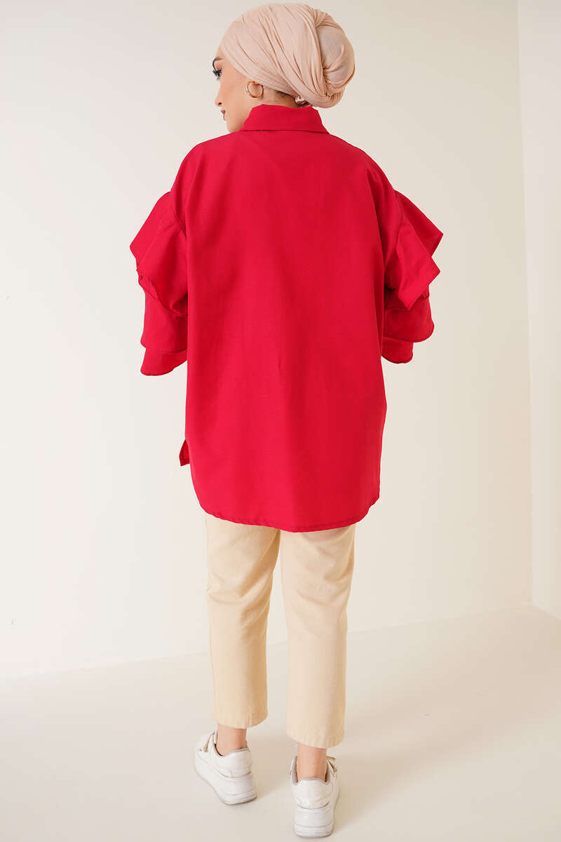 Yeni sezon gömleğimizin kolları kat kat görünümlüdür. Düşük omuz model olan gömeleğimizin etek ucunun arkası önünden uzundur. Kombinlerinzde tamamlayıcı parça olacak gömleğimiz şık duruşuyla sezonun favorileri arasında
