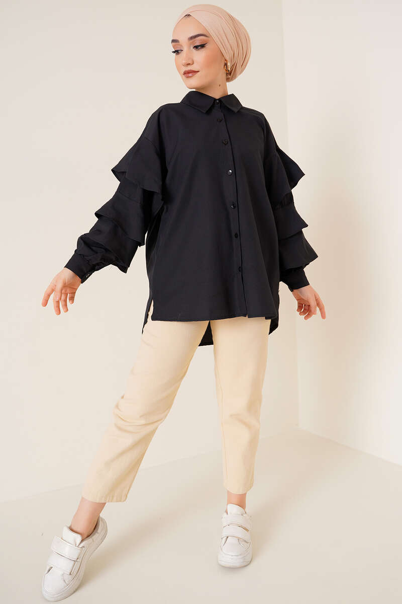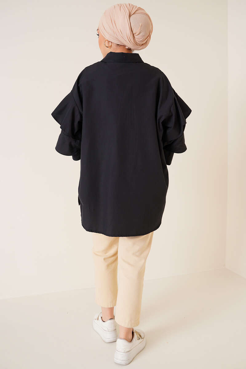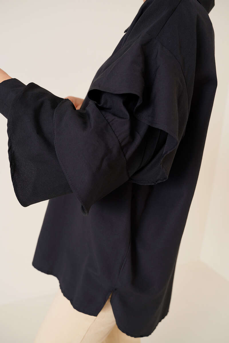 Yeni sezon gömleğimizin kolları kat kat görünümlüdür. Düşük omuz model olan gömeleğimizin etek ucunun arkası önünden uzundur. Kombinlerinzde tamamlayıcı parça olacak gömleğimiz şık duruşuyla sezonun favorileri arasında