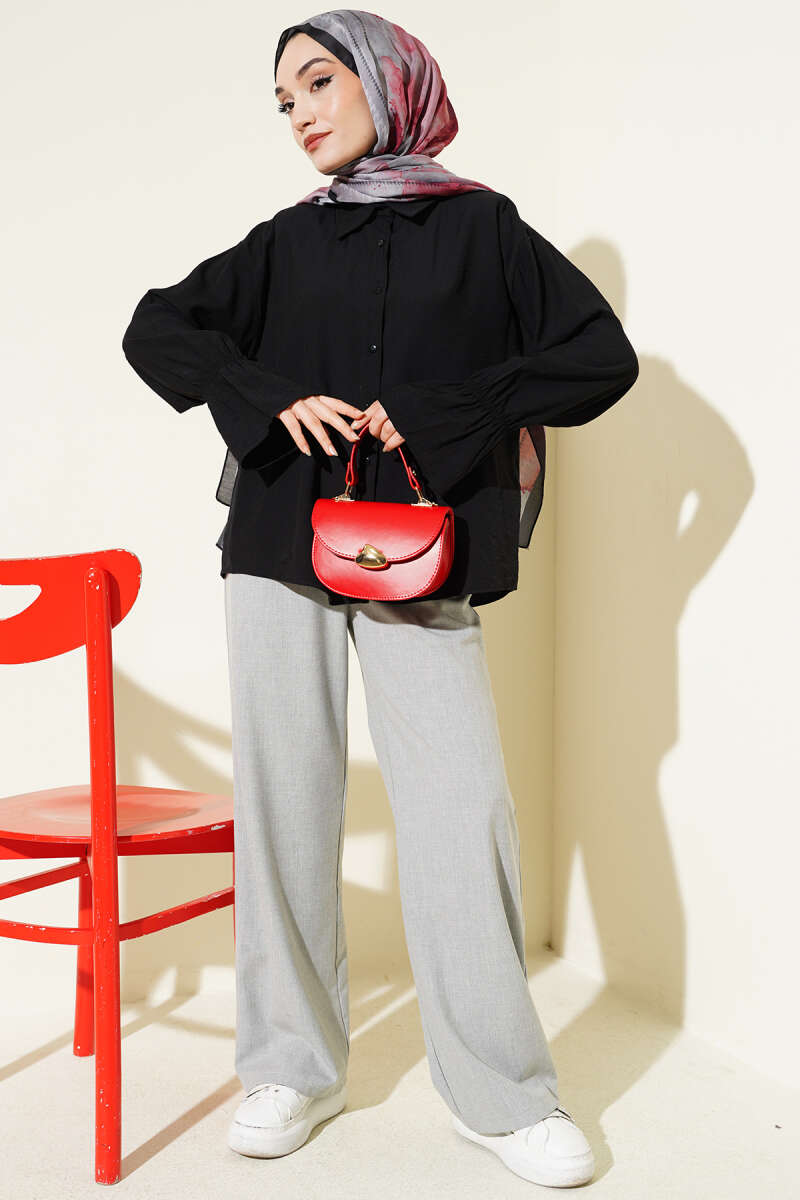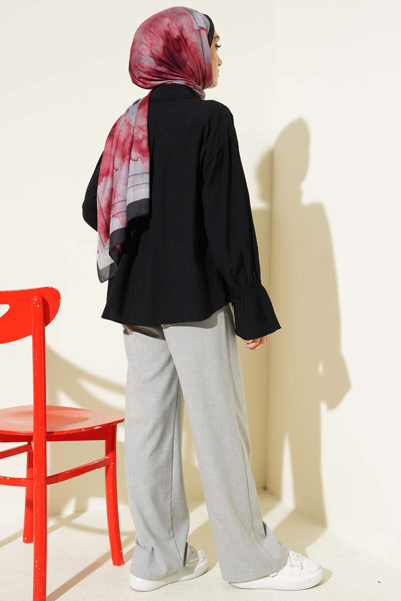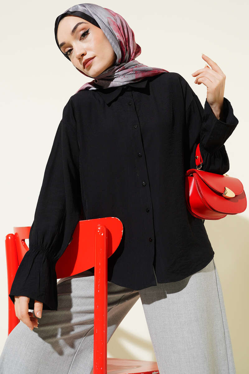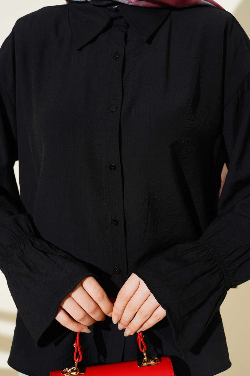 Kolları Lastikli Krinkıl Gömlek Siyah