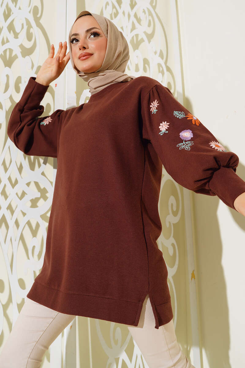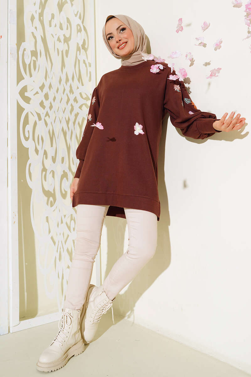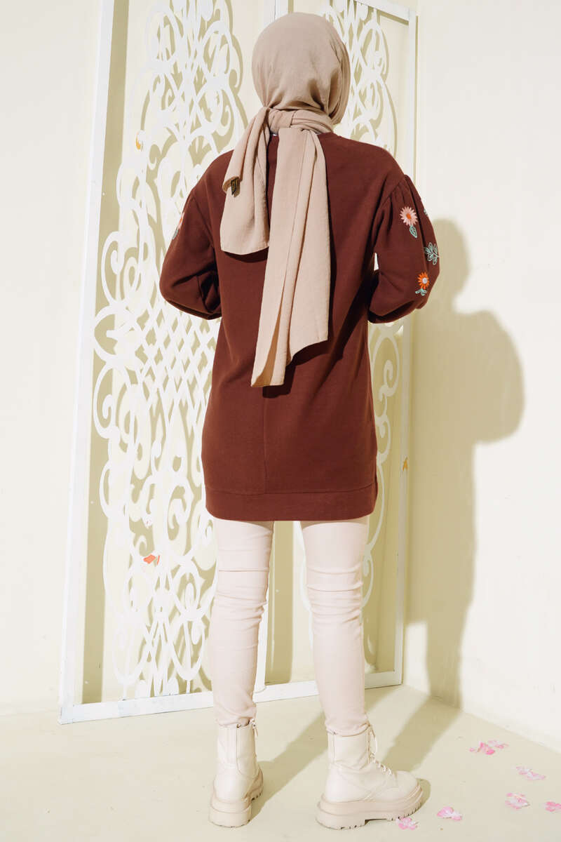 Kolları nakış işlemeli tuniğimiz şık bir görüntüye sahiptir. Bisiklet yaka tuniğimiz balon kol modeldir. Omuzları düşüktür. Önü kısa arkası uzun modeldir. Kol bilekleri rabinalıdır. Tuniğimizin etek ucunda kısa bir yırtmaç mevcuttur. Sportif ve şık kombinleyeceğiniz tuniğimiz sizleri beklemektedir.
