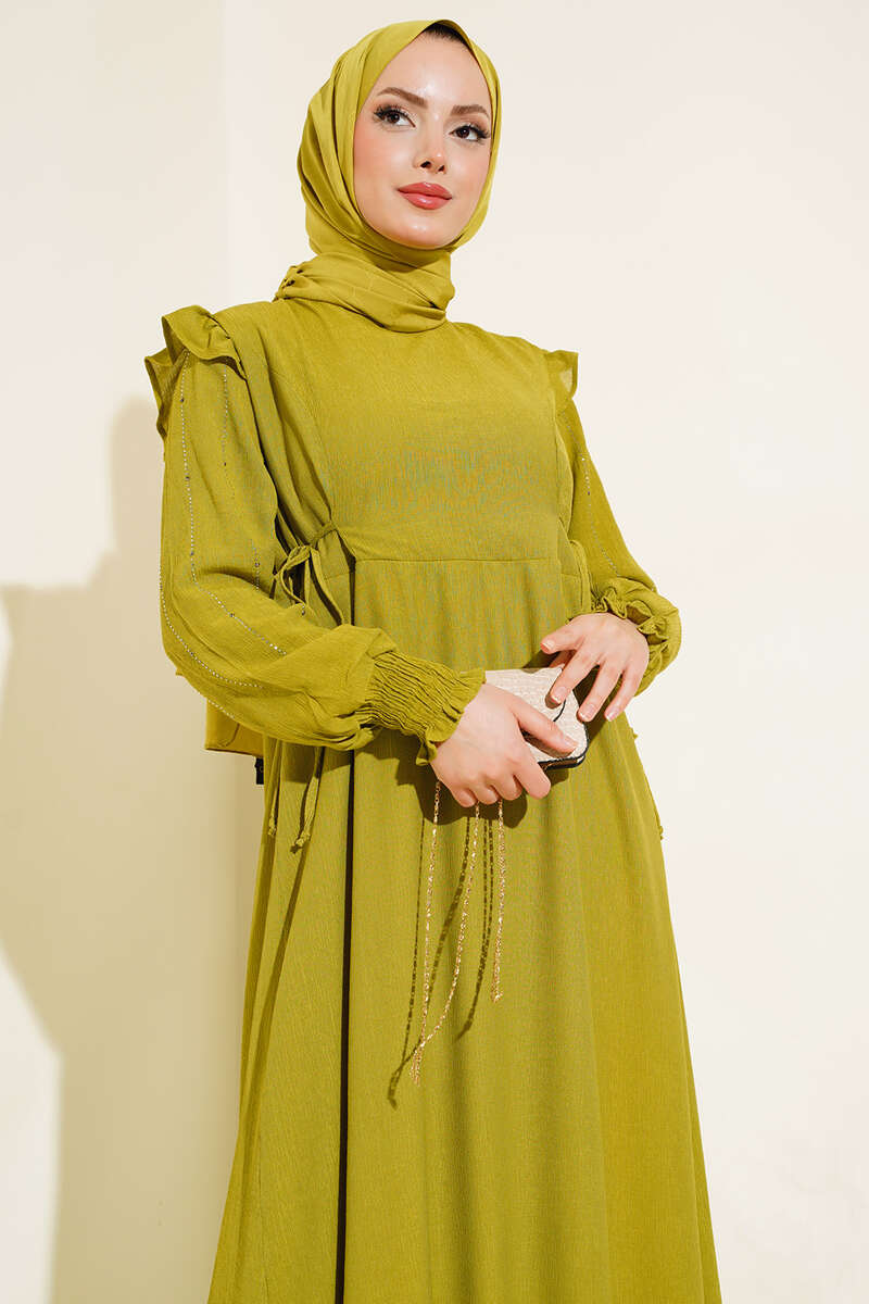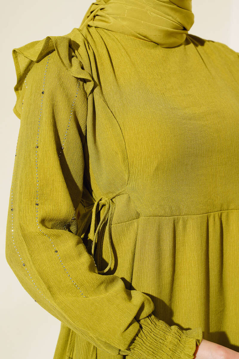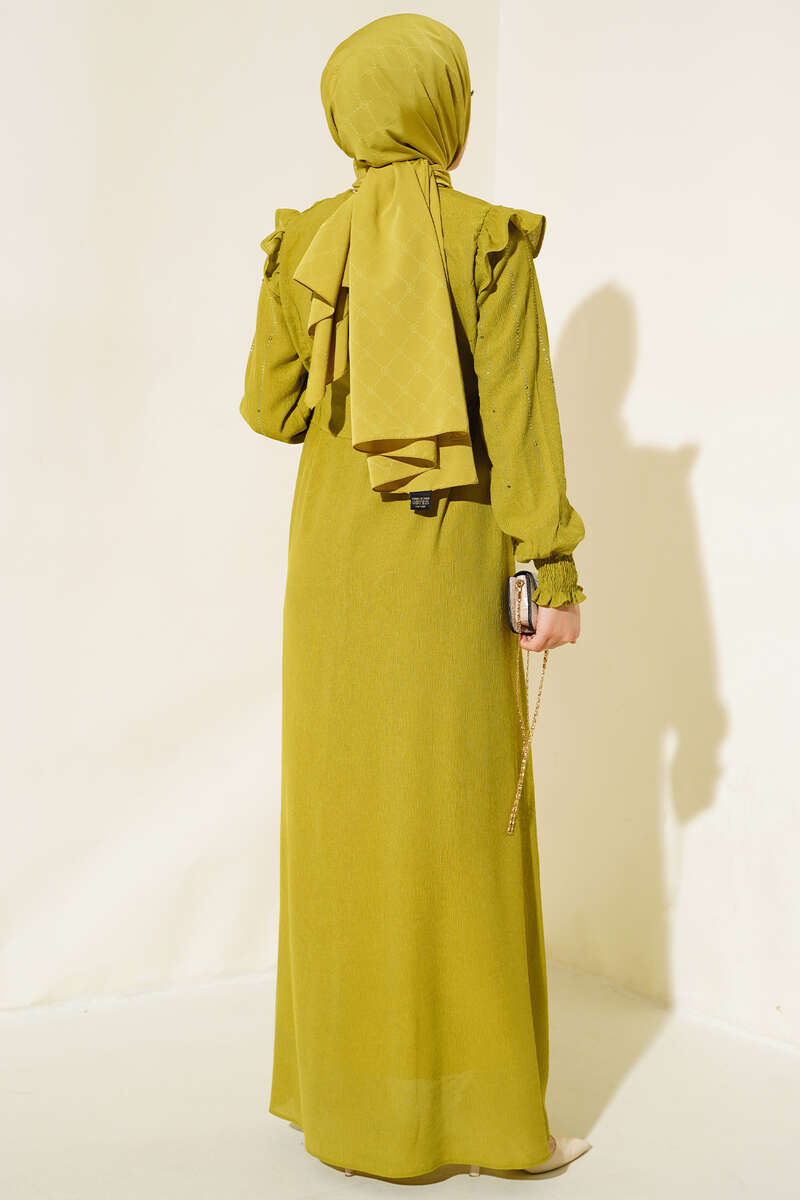 Kolları Parlak Pullu Elbise Yağ Yeşili