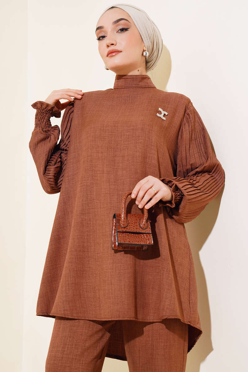 Sezonun sevilen ikili takım modelimiz sizlerle beraber. Tuniğimiz oversize modeldir. Kolları piliselidir. Kol bilekleri esneyen lastiklidir. Küçük şık aksesuarı bulunmaktadır. Pantolonumuzun beli lastiklidir. Geniş paça modeldir. Cepsizdir.