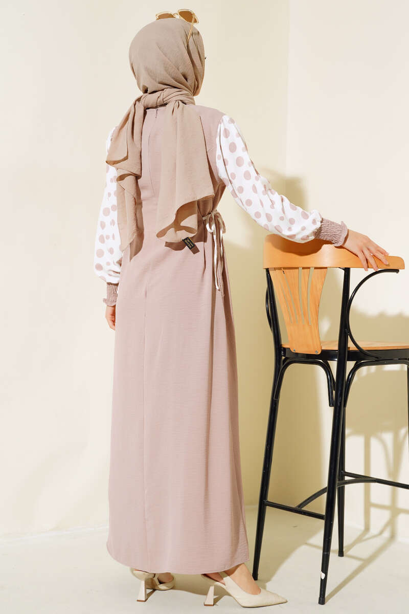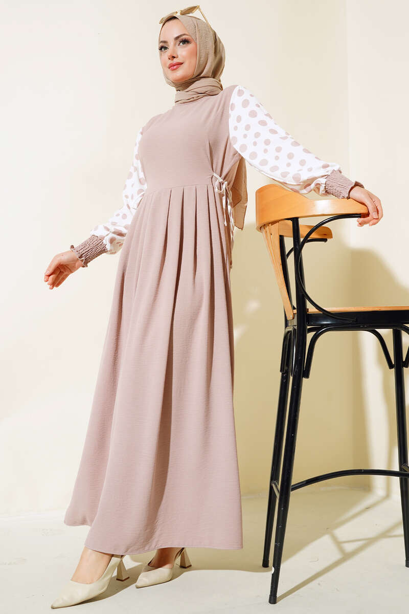 Yeni sezon elbisemiz şık tasarımıyla sizler için geldi. Elbisemizin kolları puantiye desenlidir. Kol bilekleri gipelidir. Elbisemizin önü iplidir. Sırtı fermuarlıdır. Oval yakadır. Elbisemiz astarlıdır. Renk seçenekleriyle dolabınızda yerini beklemektedir.