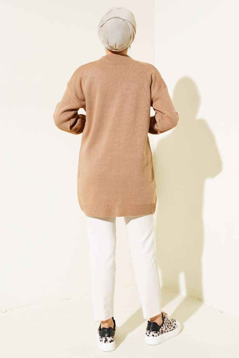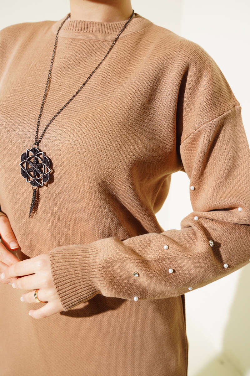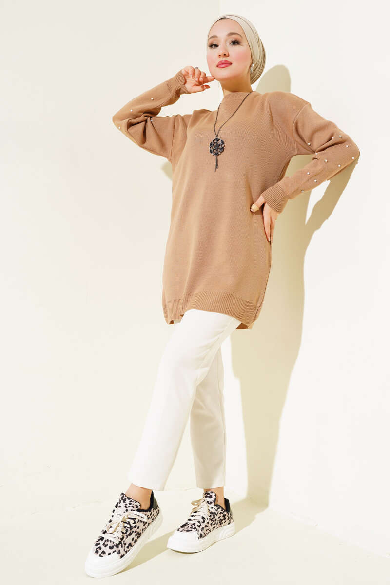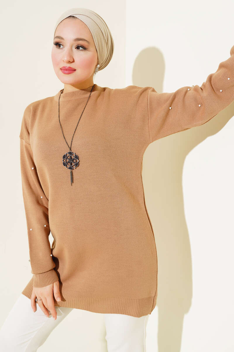 Kolları Taş Detaylı Triko Tunik Büsküvi