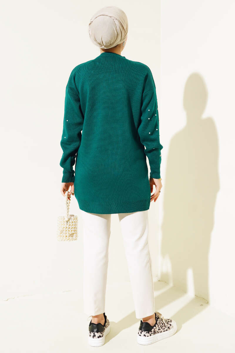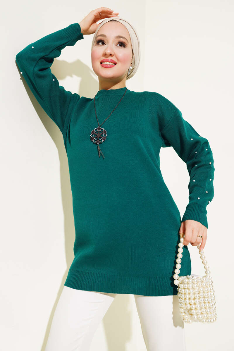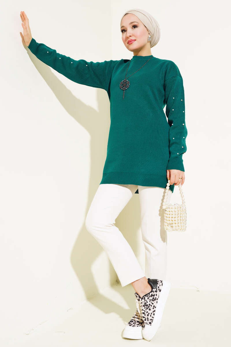 Kolları Taş Detaylı Triko Tunik Zümrüt