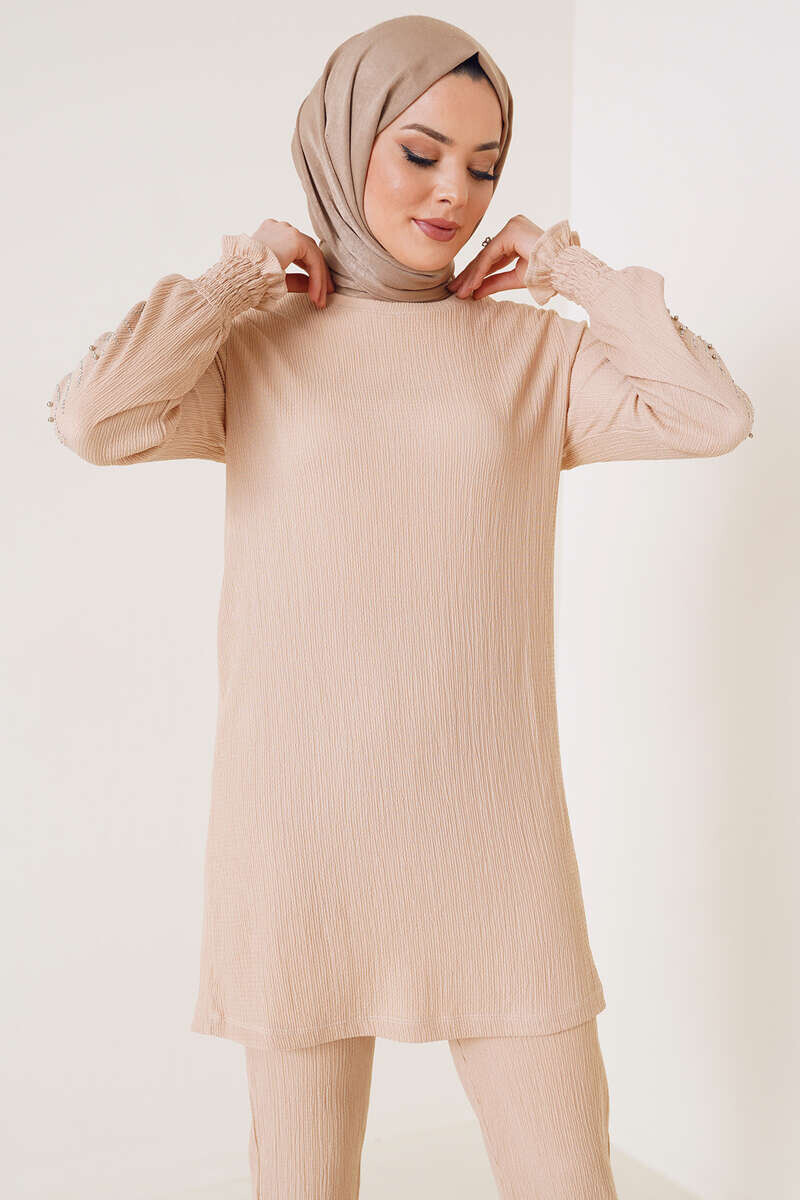 Yeni sezon bürümcük ikili takım rahatlığı ve şıklığı bir arada tutmaktadır. İkili takımımızn tuniği kollarında taş süslemeleri bulundurmaktadır. Bilek ksıımları gipe detaylı olan tuniğimiz bisiklet yakadır. İkili takımımızın pantolonu cepsiz modeldir. Beli lastiklidir.
