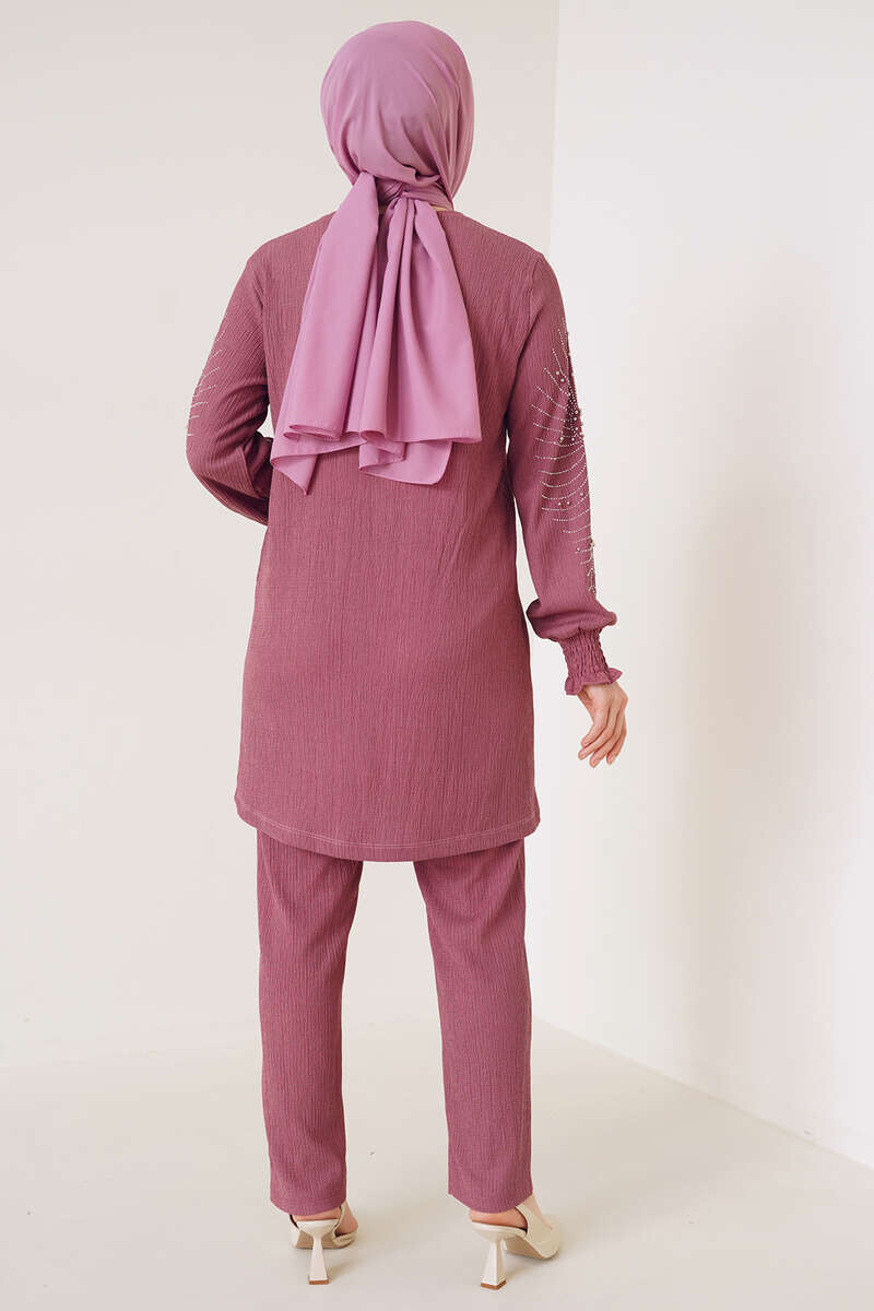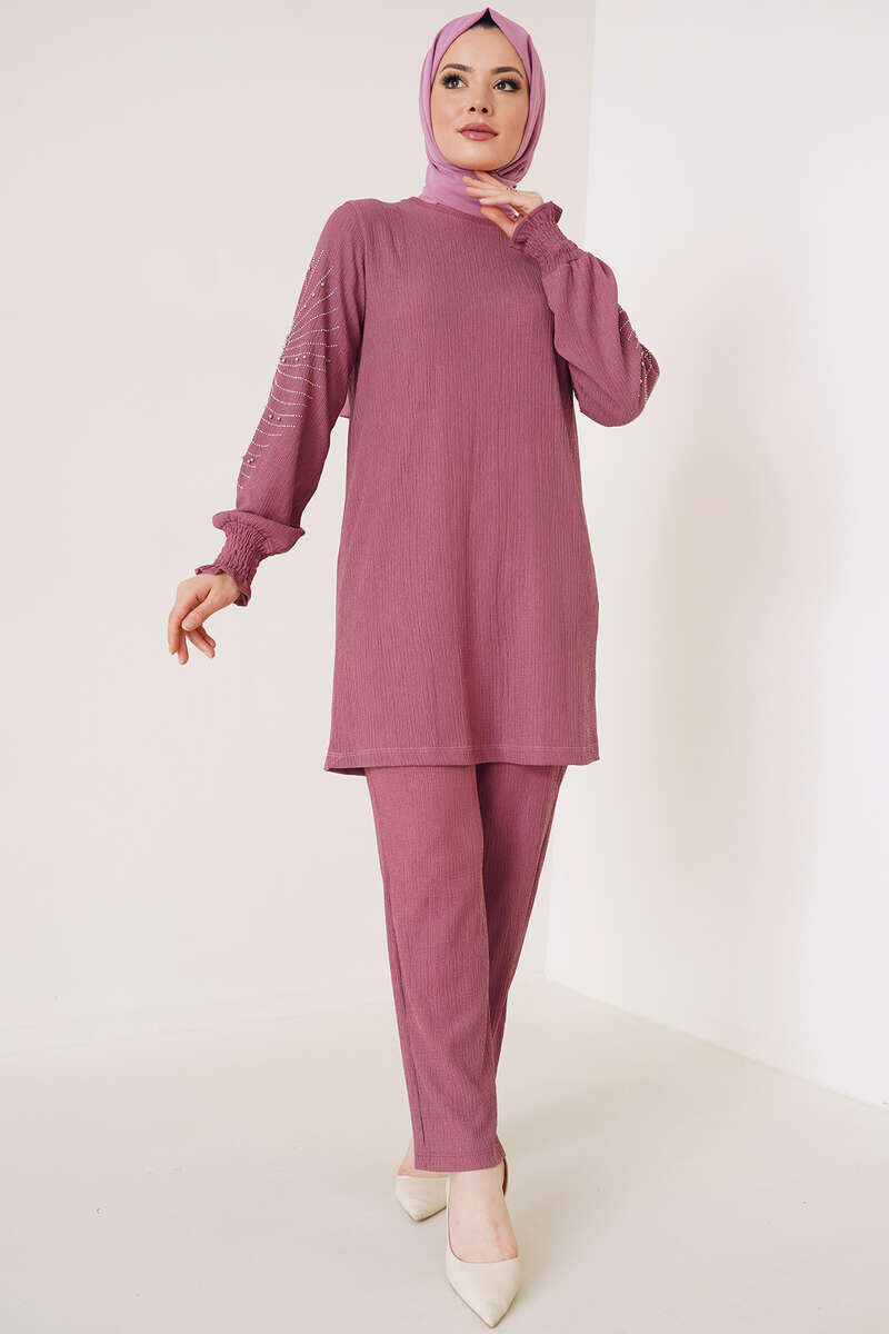 Yeni sezon bürümcük ikili takım rahatlığı ve şıklığı bir arada tutmaktadır. İkili takımımızn tuniği kollarında taş süslemeleri bulundurmaktadır. Bilek ksıımları gipe detaylı olan tuniğimiz bisiklet yakadır. İkili takımımızın pantolonu cepsiz modeldir. Beli lastiklidir.