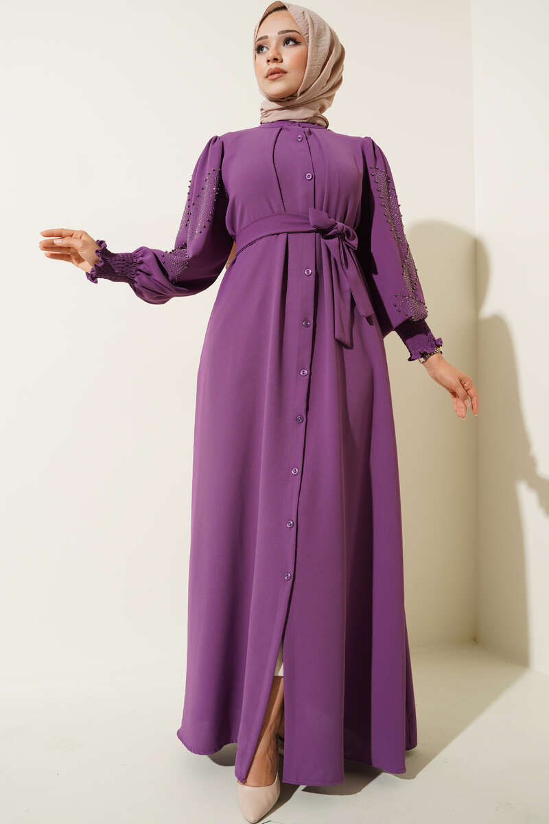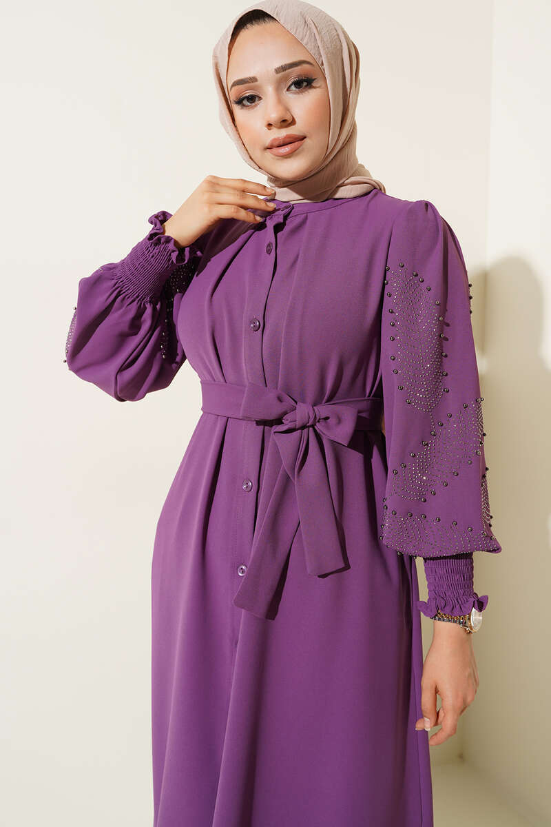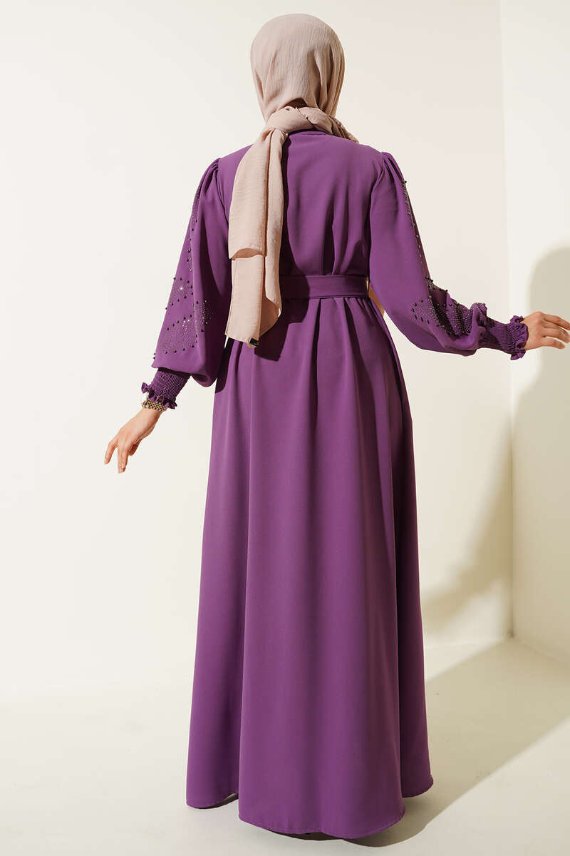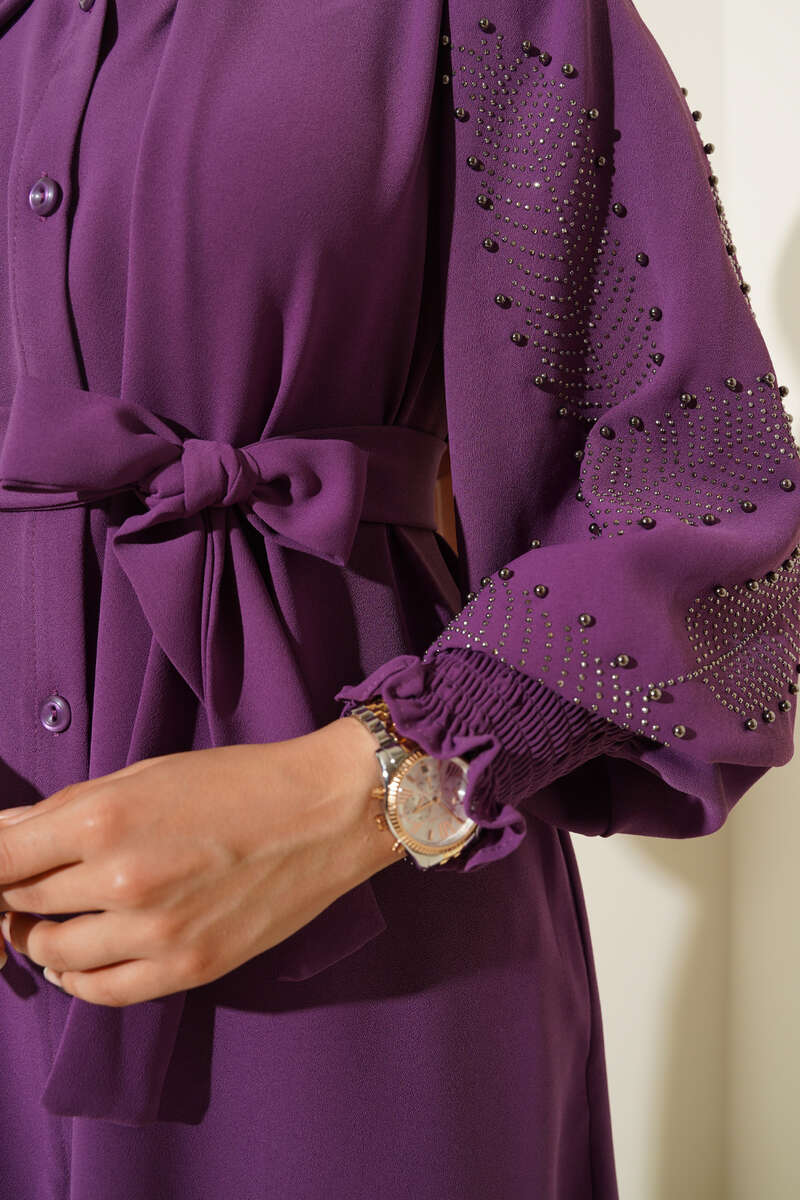 Kolları Taşlı Kuşaklı Elbise Menekse