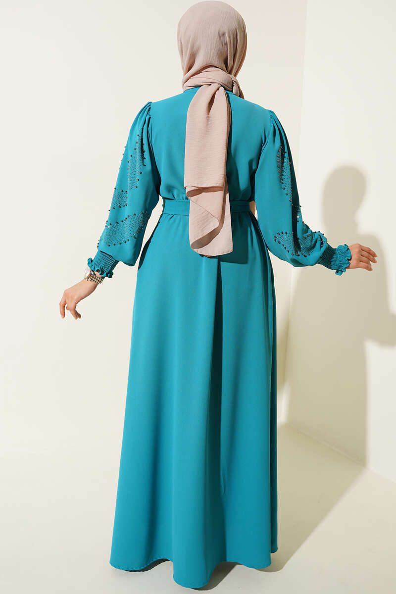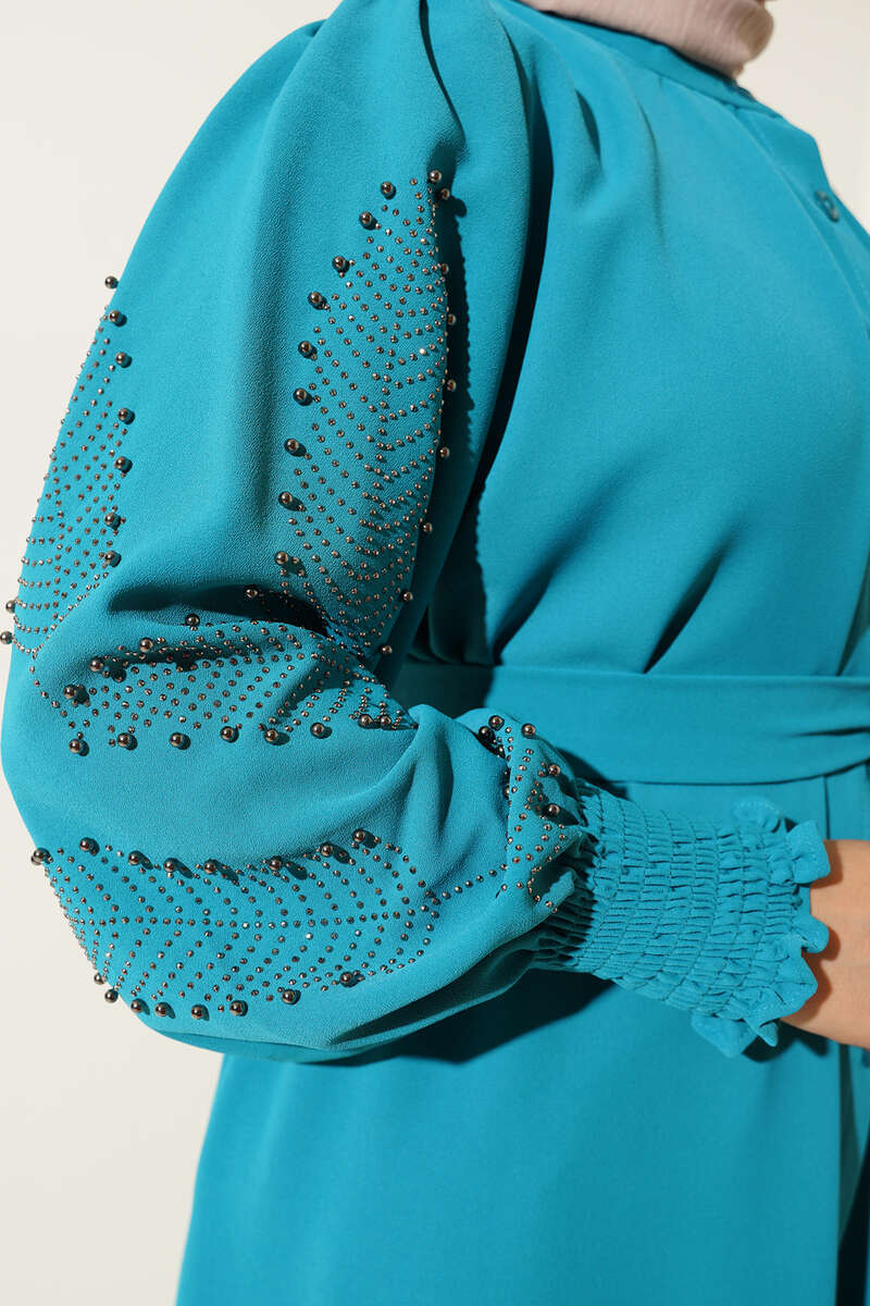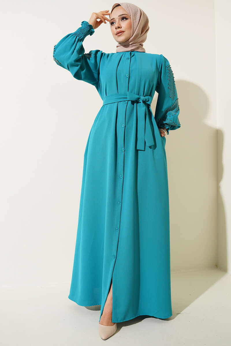 Yeni sezon boydan düğmeli elbisemiz bu yaz favoriniz olacak. Elbisemizin kolları taş detaylarıyla süslenmiştir. Bilekleri gipeli olan elbisemizin kendi kumaşından kuşağı bulunmaktadır. Boydan düğmeli olan elbisemizin cepleri mevcuttur.